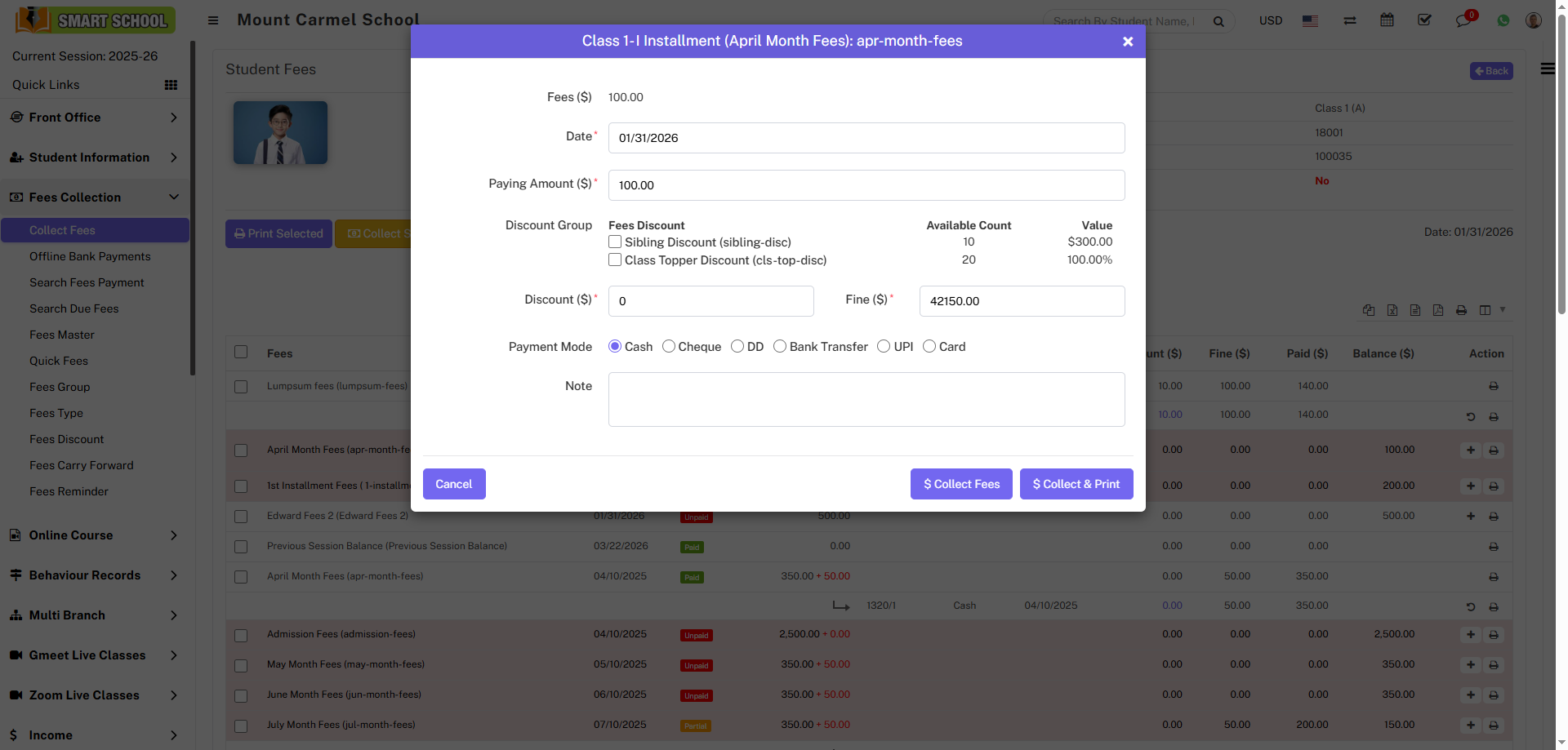 To view fees detail click on Collect Fees button present at Action column in the student list, at click of this button Student Fees page will be open. Here you can see all assigned student fees details. To collect fees click on Add (+) icon present in action column, at click of this icon modal will be open. Fill all the details entries Date, Amount, Discount Group, Discount, Fine, Payment Mode (Cash, Cheque, DD, Bank Transfer, UPI, and Card) and Note (if you have any note) and then click on Collect Fees button.