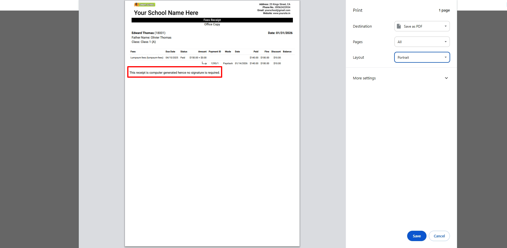 In the receipt, you can see the all details related to fees as well as you can also see the one note that says, "This receipt is computer generated, hence no signature is required