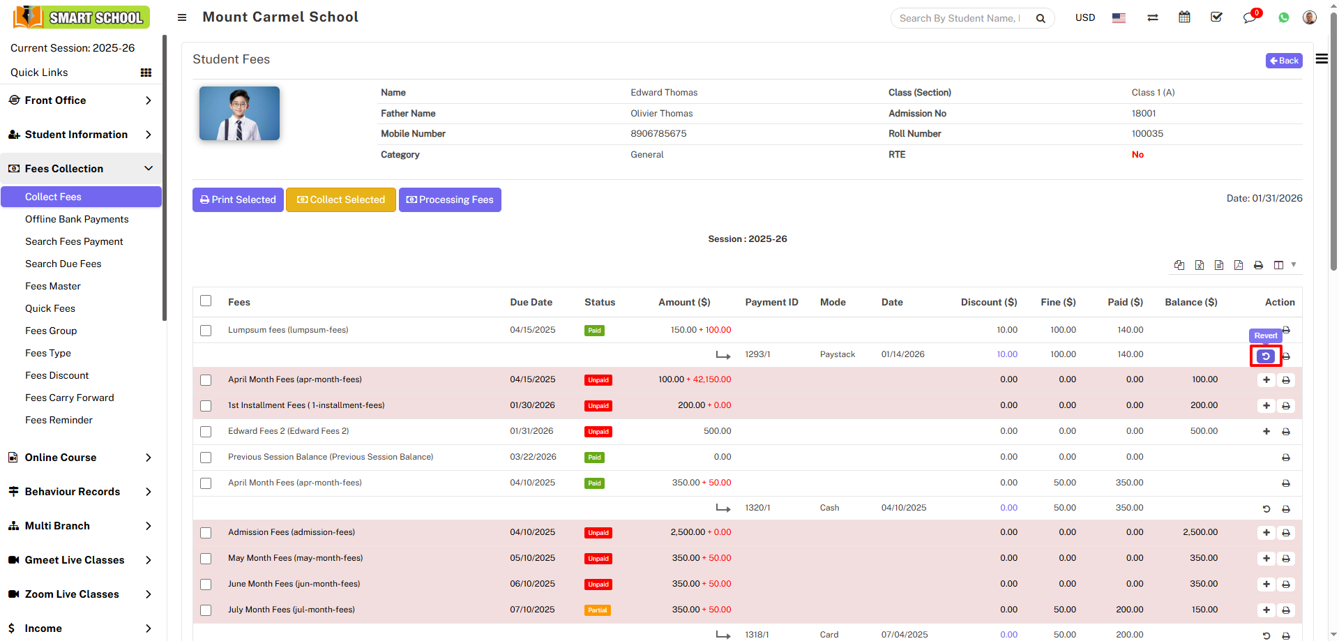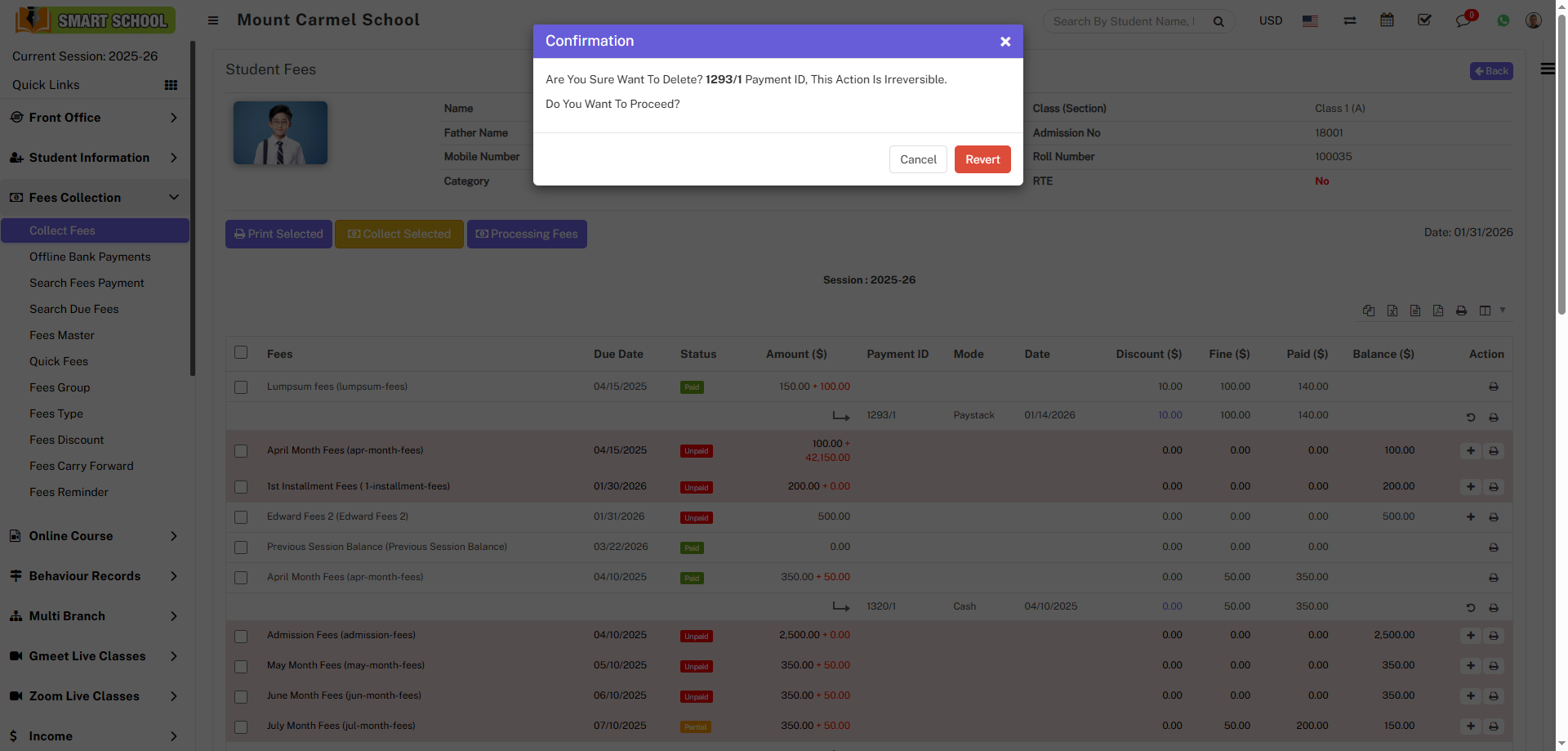 now click on Revert button, so that student fees will be reverted.