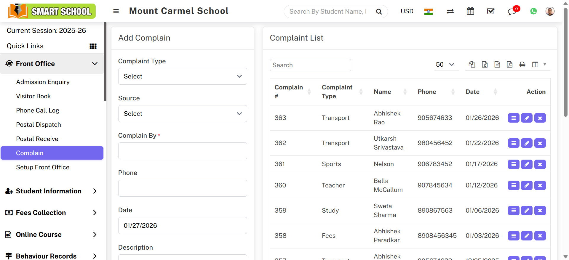 To edit complain click on Edit icon and to delete complain click on Delete icon present in complain list.