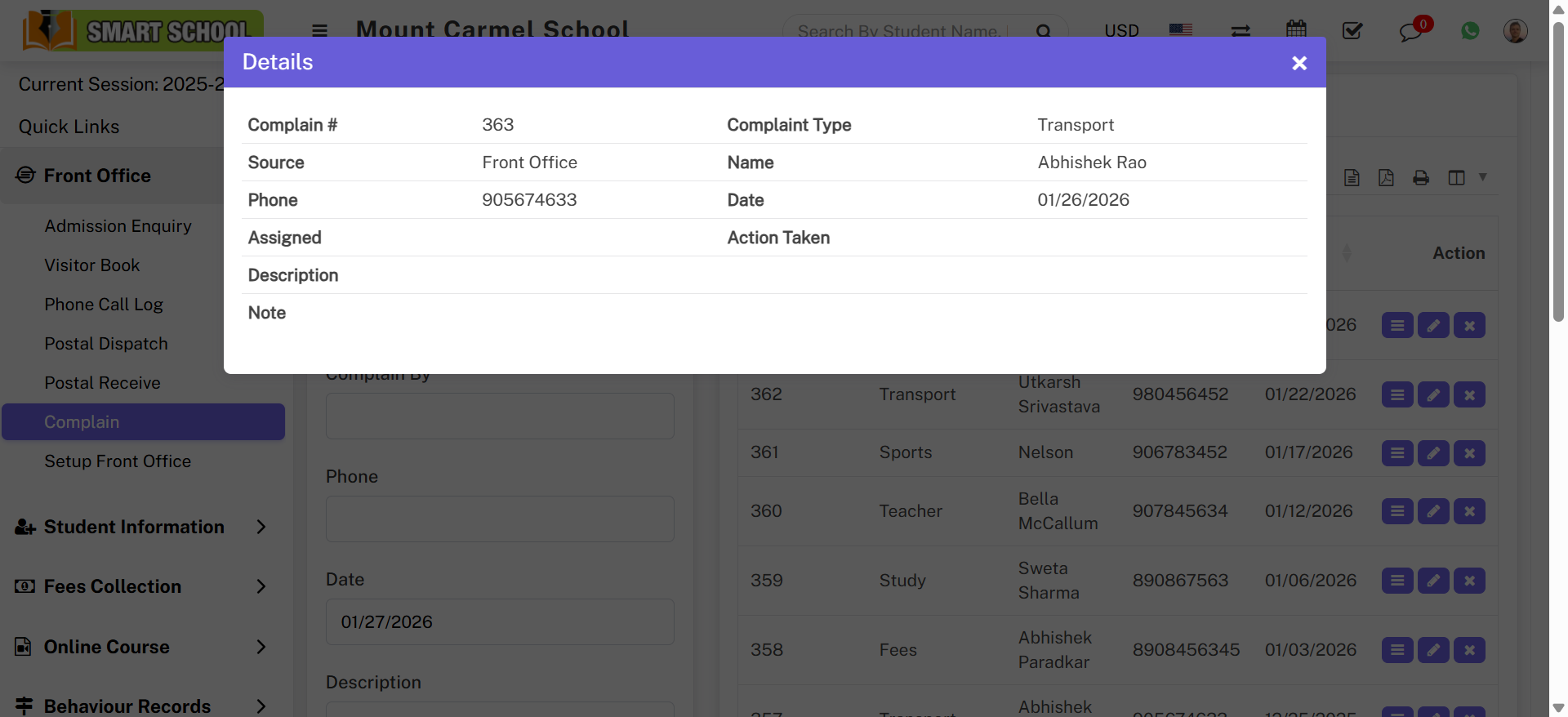 To view complain click on View icon present at Action column in the complain list, at click of this icon Details modal will be open. Here you can see the details of the complain.