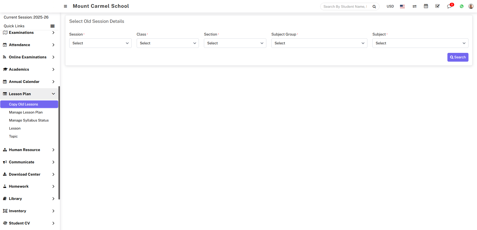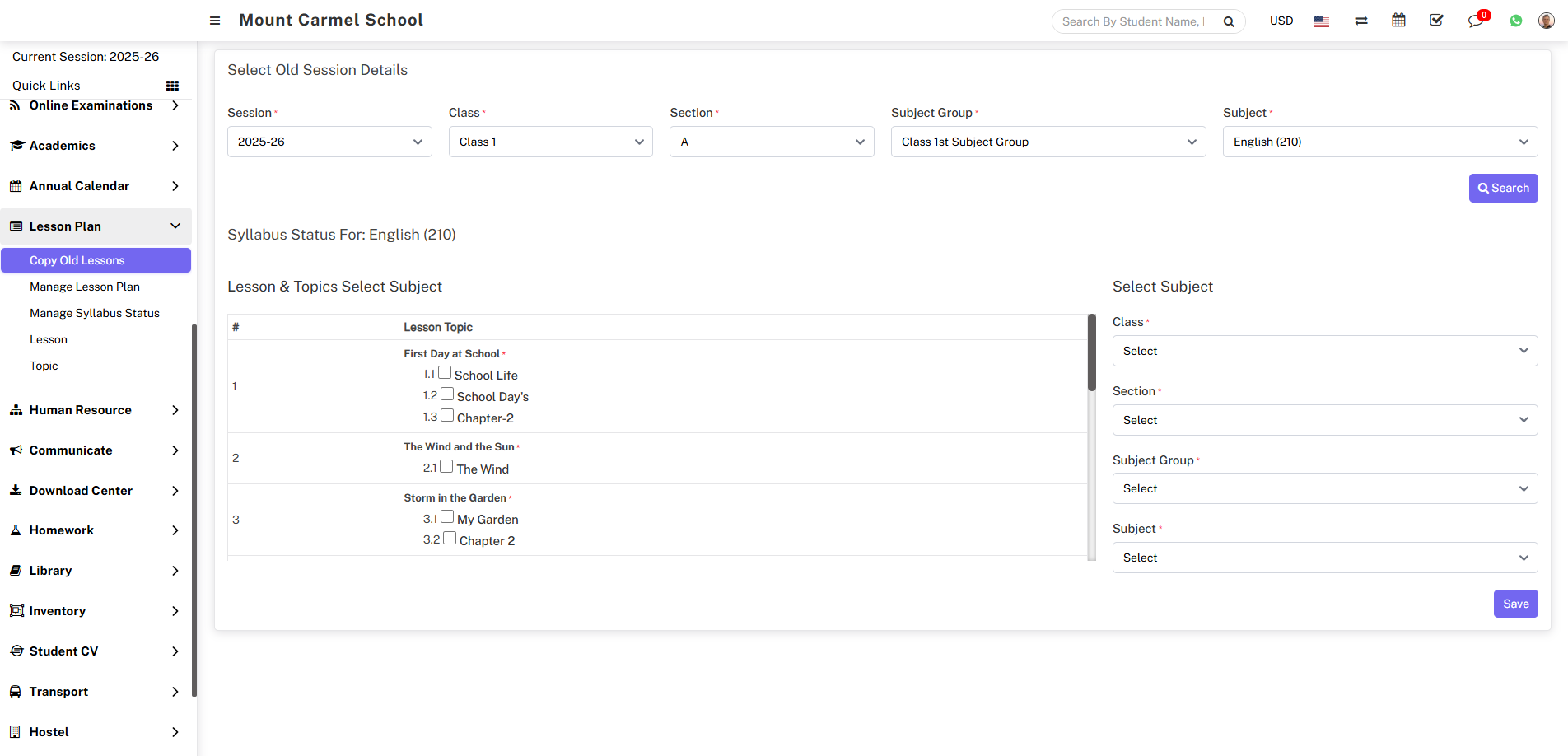 To add Copy Old Lessons go to Lesson Plan > Copy Old Lessons then Select the preferred Session, Class, Section, Subject Group, Subject and click on Search button.