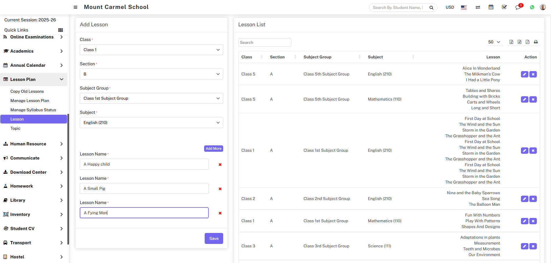 You can edit the lesson by clicking the edit button showing in Action column, just click on Edit button, edit module will be open now here you can update the lesson and click on Save button your lesson will be update successfully.