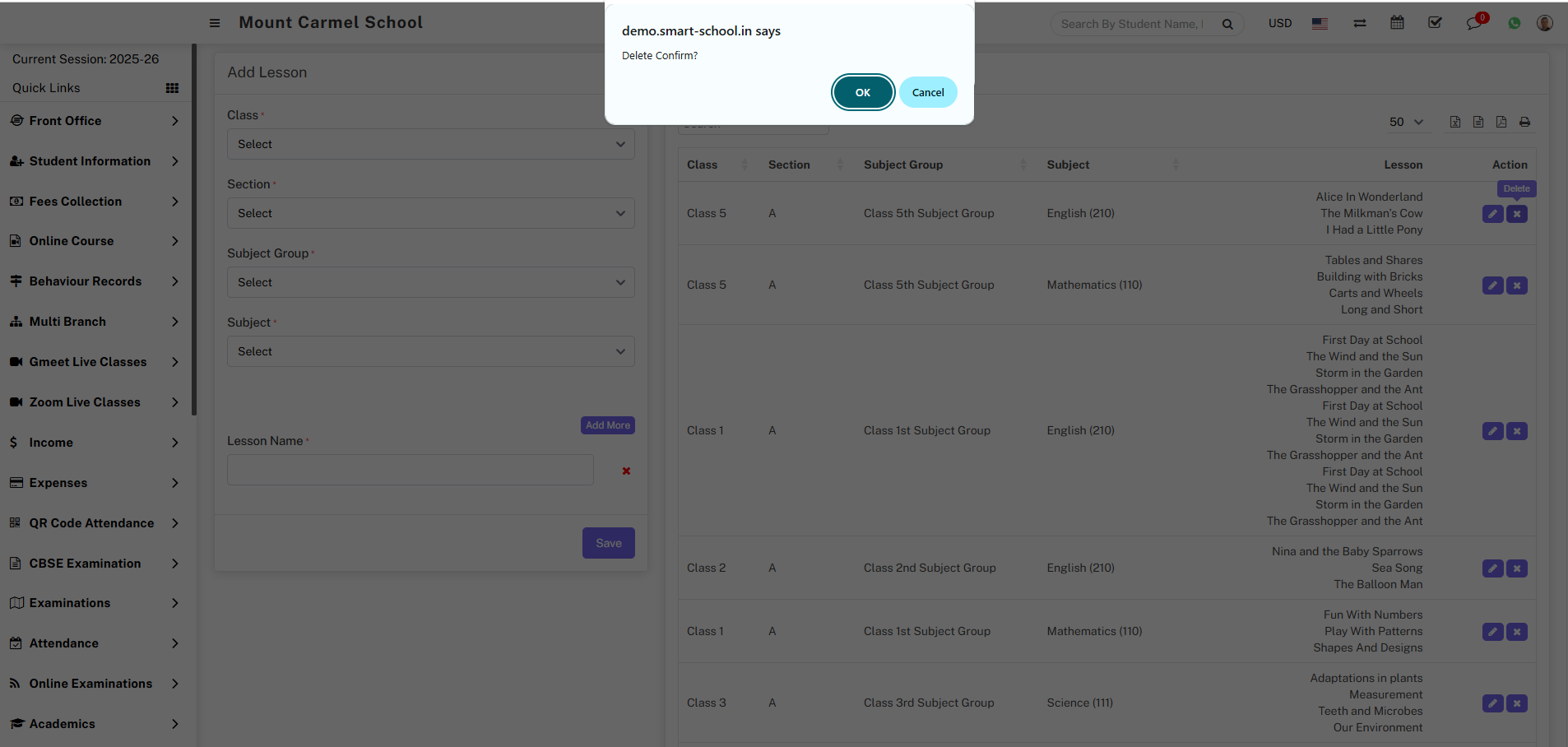 Now click on OK button, your lesson will be Delete successfully.