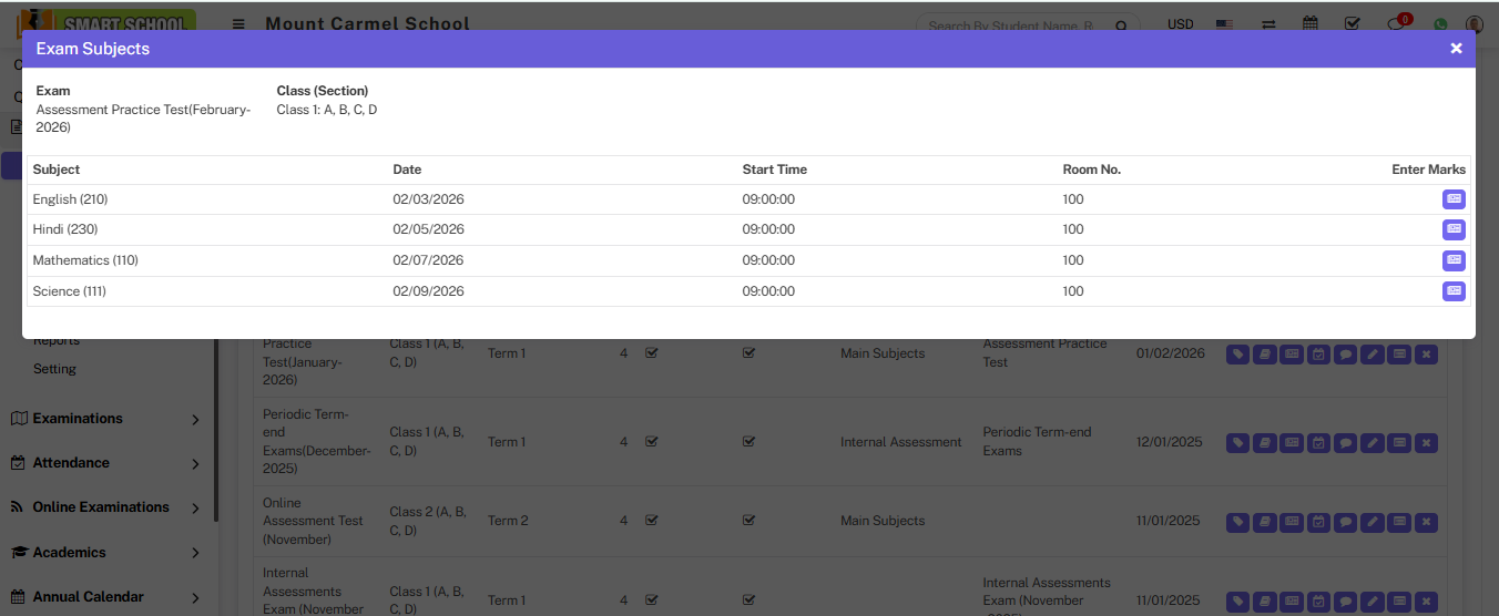 On this model, you can view the details of the Exam, Class, Section, and all the subjects with their respective Dates, Times, and Room numbers that you previously added through the Add Exam Subject feature. Additionally, you can now see the Enter Marks column where you can add marks subject-wise. To do so, simply click on the icon corresponding to the subject for which you want to enter marks. For example, if you click on the first icon for the Hindi subject, the Enter Hindi Marks model will appear.