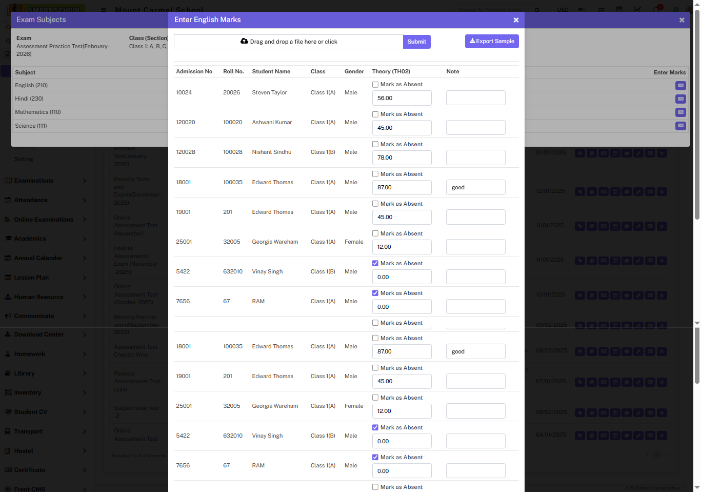 In this model, you can view multiple students for a particular subject along with their Admission Number, Roll Number, Father's Name, and Gender. You can also see the Theory and Practical columns with corresponding input fields. Simply enter the marks based on the students' performance along with any notes you want to include regarding their performance. If a student was absent during the relevant exam, simply check the Mark As Absent checkbox located above the input field and finally click on the save button and marks will be save for that subject successfully. Please follow the same process to enter the marks for all subjects for the student.