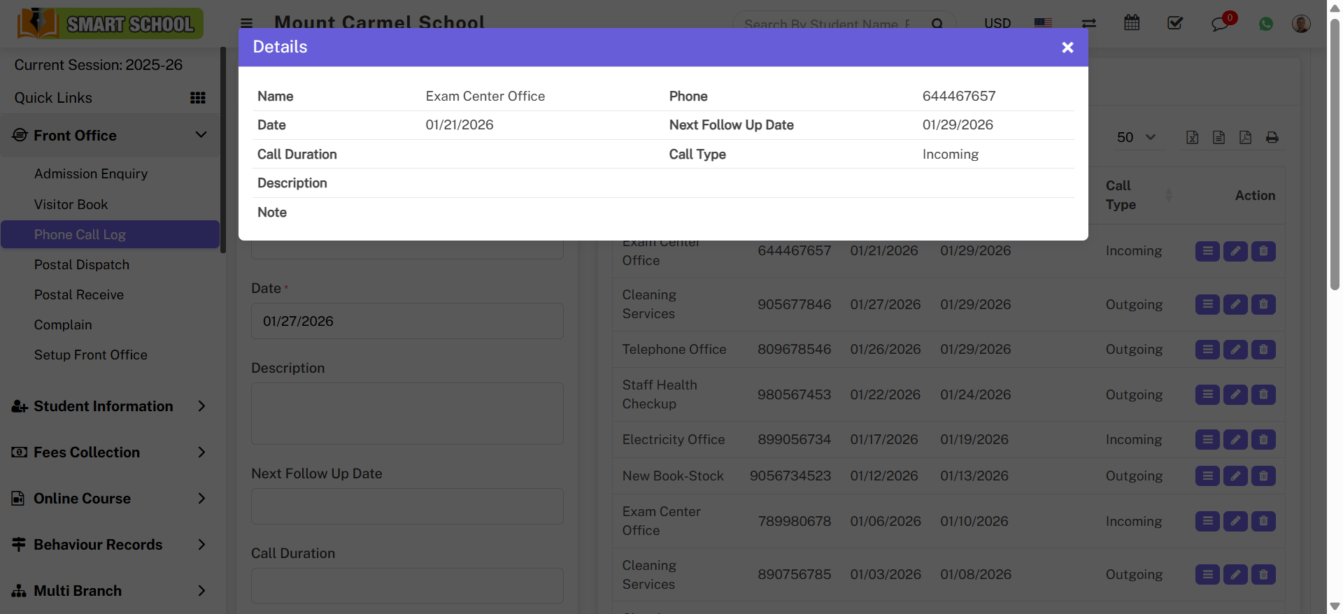 To view phone call log click on View icon present at Action column in the phone call log list, at click of this icon Details modal will be open. Here you can see the details of the phone call log.