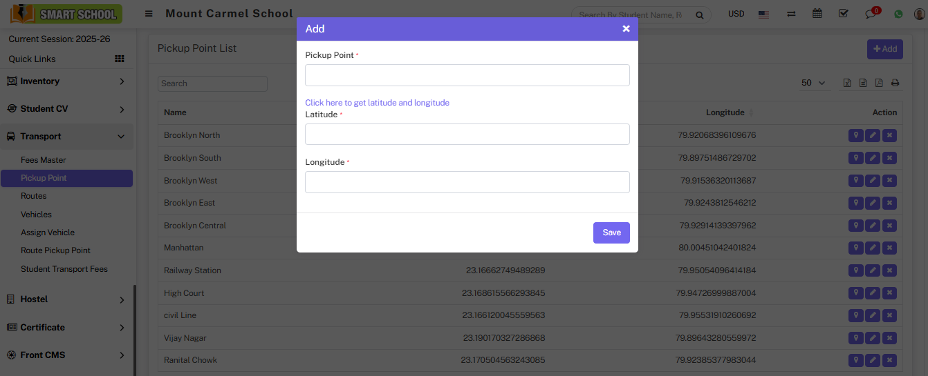 To add a pickup point, go to Transport > Pickup Point. The pickup point list will be open, and the "add" button will be visible in the right top corner; now click on the "add" button to open add pickup point model, and fill in the details as pickup point, latitude, and longitude. For latitude and longitude, one option is available above latitude, which is "Click here to get latitude and longitude." With the help of this link, it will take you to the Google Maps page. Now, write here your pickup point so that Google Maps will show you the latitude and longitude of that pickup point, which you can use and then click on save button.