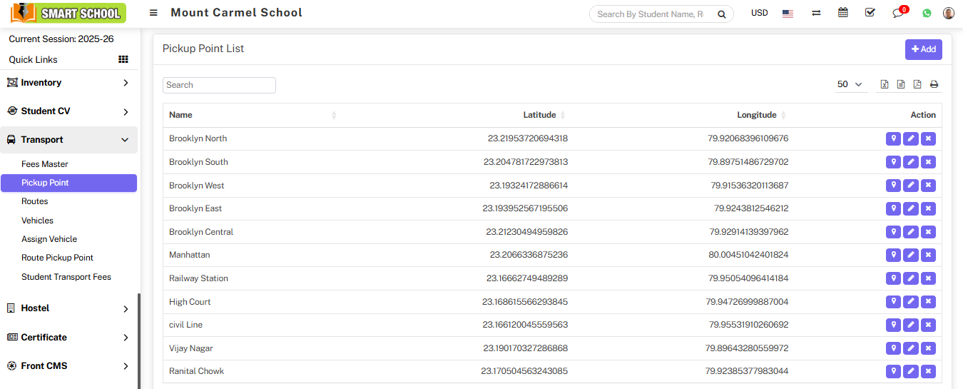 Now, here you can see pickup points in the Pickup Point List, in the list, you can see the column of pickup point name, latitude, and longitude; and in the action column, you can see the map icon, edit icon, and delete icon are available.