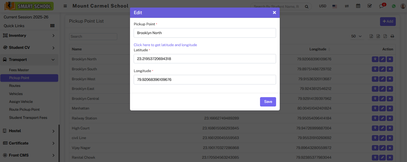 When you click on the map icon, it will open the google map of that pickup point with its assigned latitude and longitude, and if you want to update the pickup point's latitude and longitude, just click on the Edit button. The edit model will open, and you can update the details before clicking on the Save button.