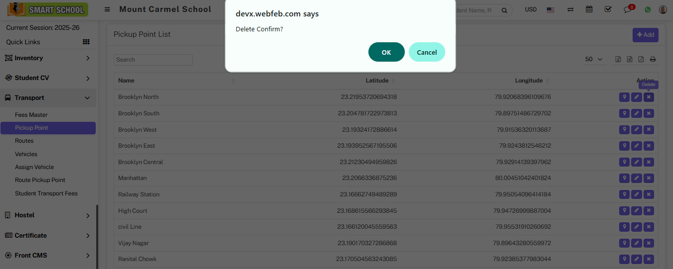 If you want to delete the pickup point, simply click on the "delete" (cross) icon in the action column, the confirmation model will appear; click on the "OK" button.