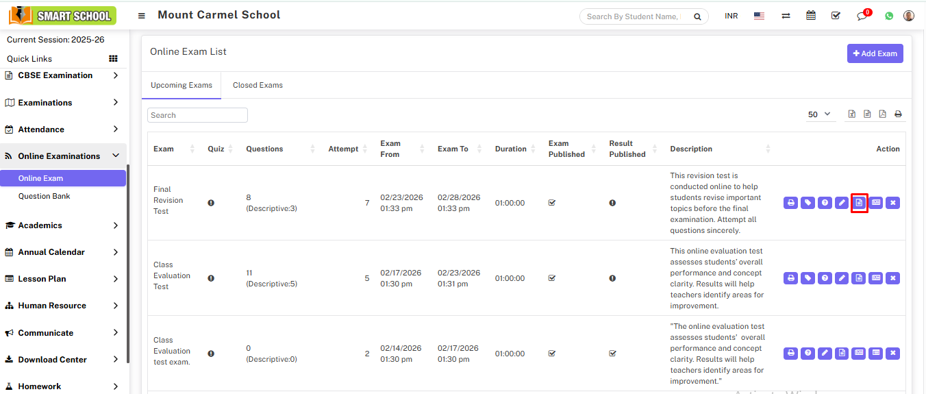 To view question list of perticular exam, click on the File-Text icon, this will show you all the question list related to the exam.