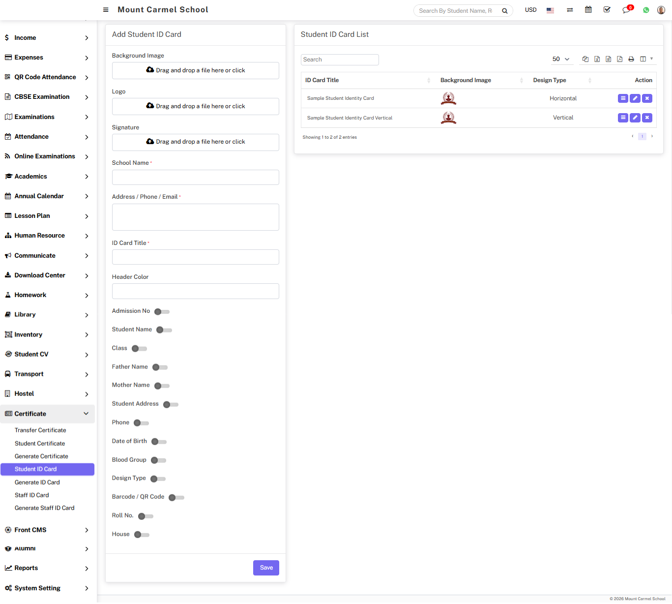 To edit ID card click on Edit icon and to delete ID card click on Delete icon present in the student ID card list.