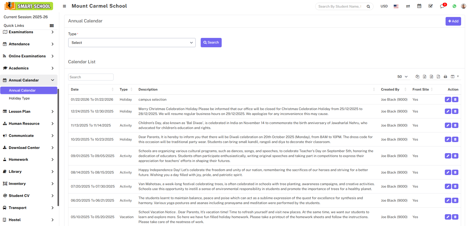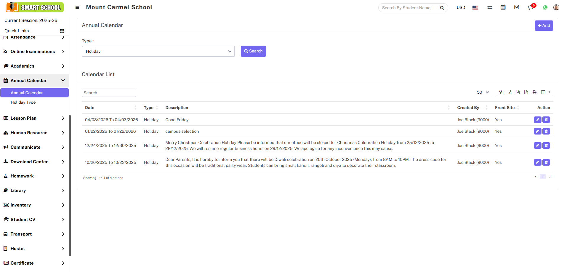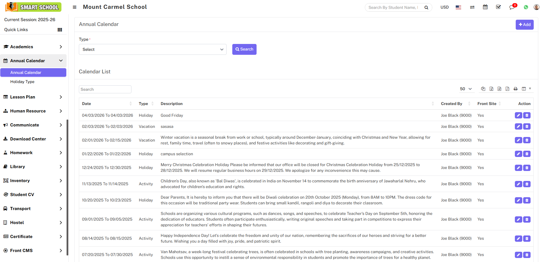 In the calendar list, you can see the details of the holiday you added, including the holiday dates, description, created by, front-side visibility status, and options to edit or delete it.