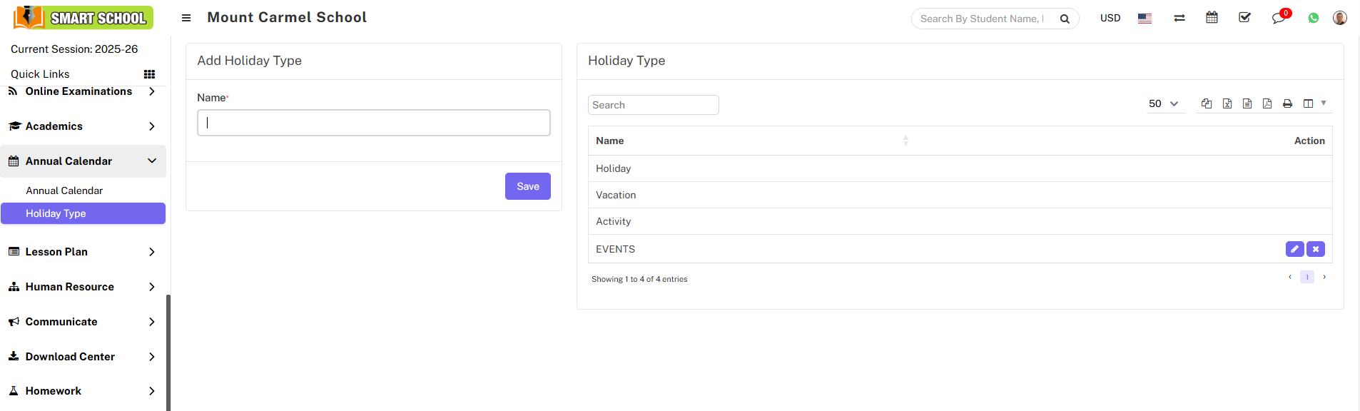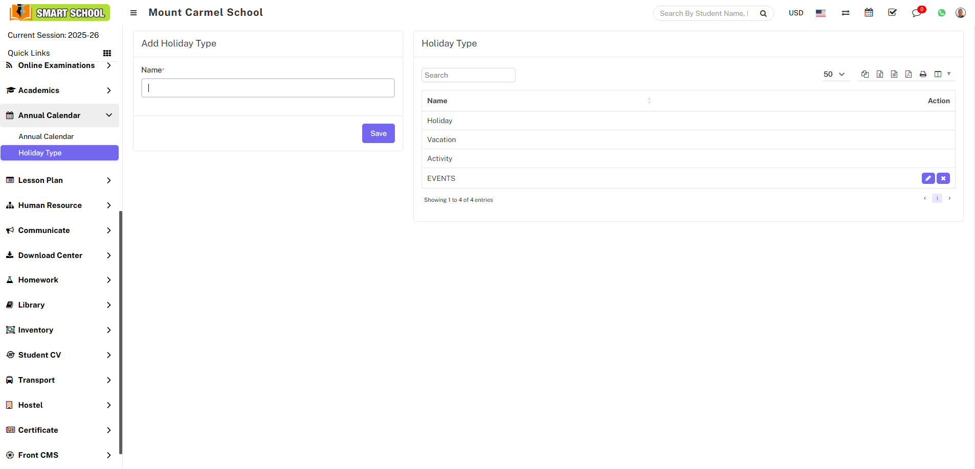 Before adding a holiday to the calendar, you first need to add the holiday type. Below the Annual Calendar, click on the Holiday Type option. From here, you can add multiple holiday types and save them. This serves as the master list, allowing you to manage the holiday types that will be displayed in your Soft School.