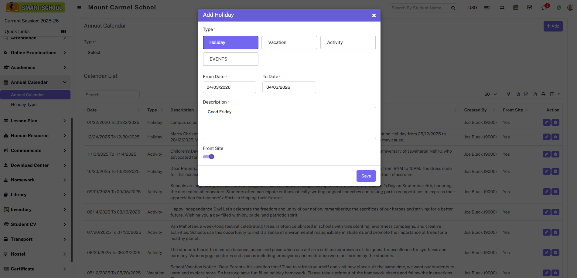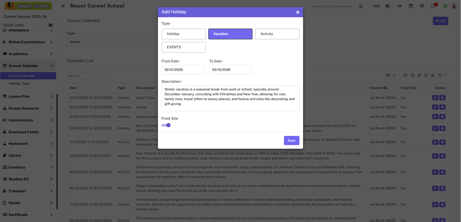To add a holiday to the calendar, simply select Holiday under the Type option, choose the From and To dates for the holiday duration, enter a description, enable the toggle button if you want the holiday to be visible on the front side of your Soft School, and click the Save button to successfully add the holiday