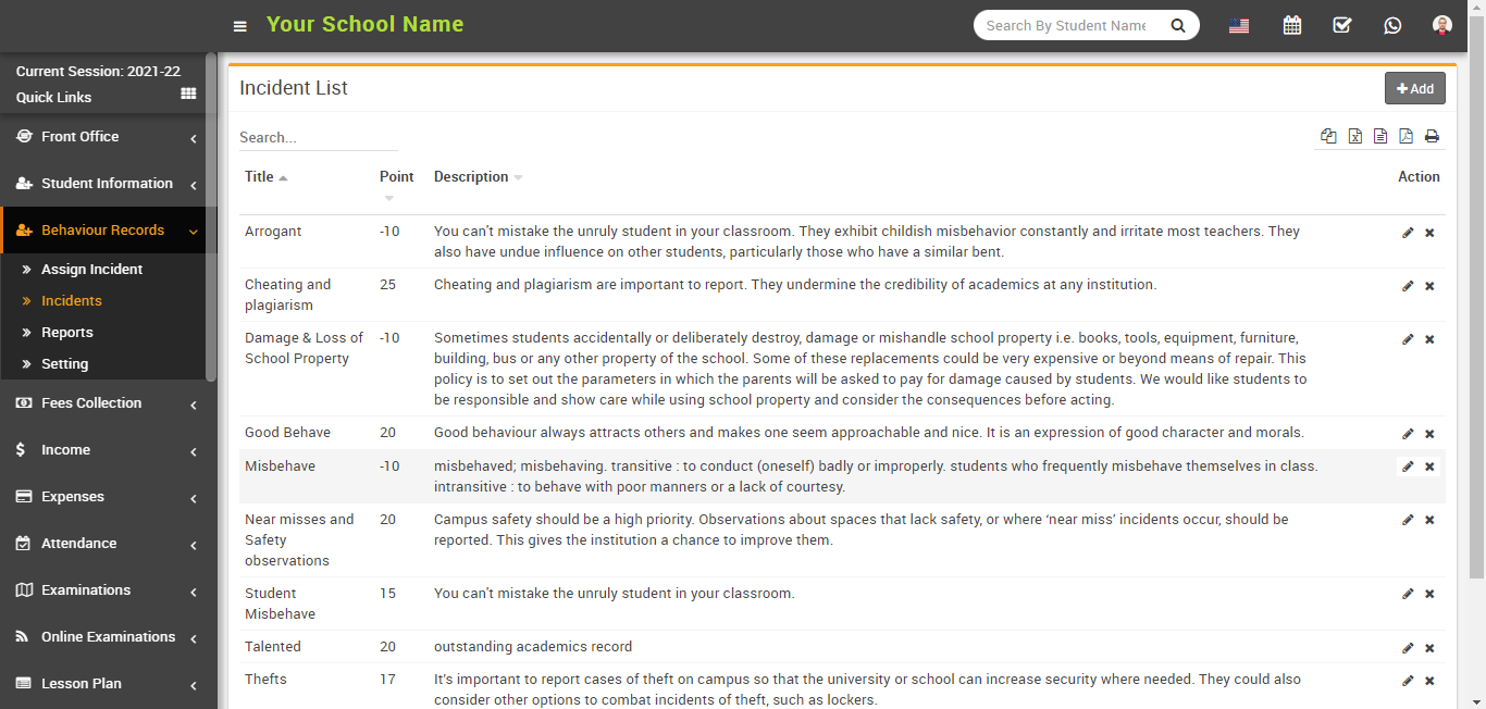 To add the incidents, go to the Behaviour Records > Incidents. The incident list page will be open, and now in the top right corner you can see the +Add button showing. With the help of this button, you can add the incidents.