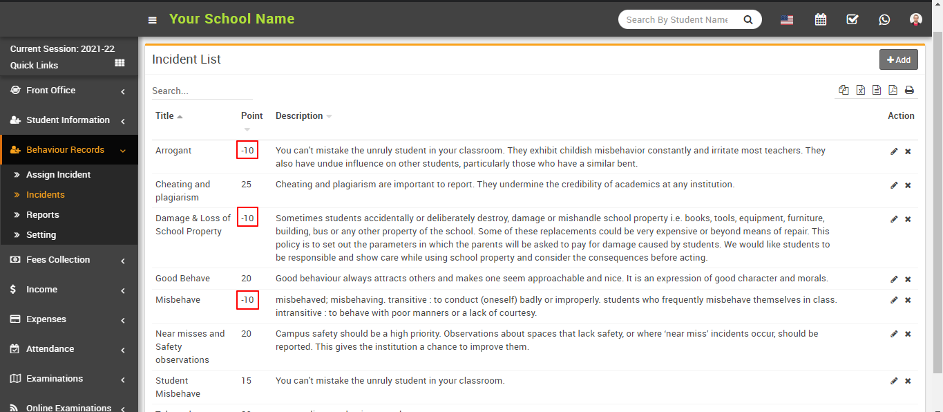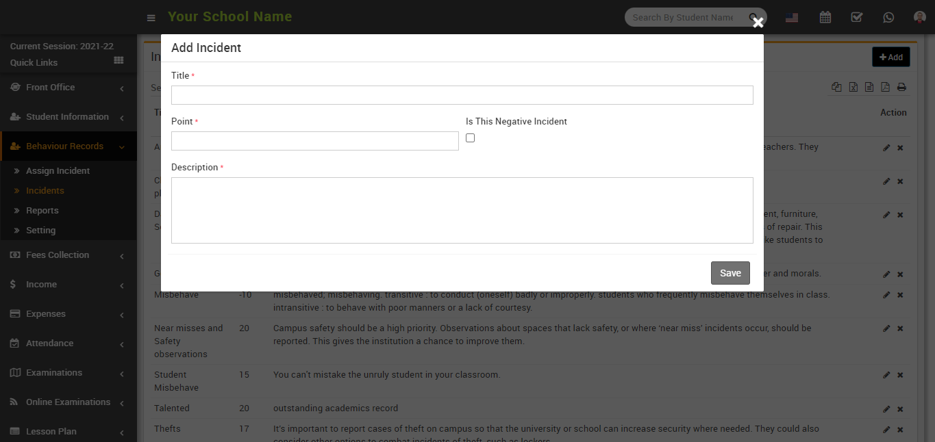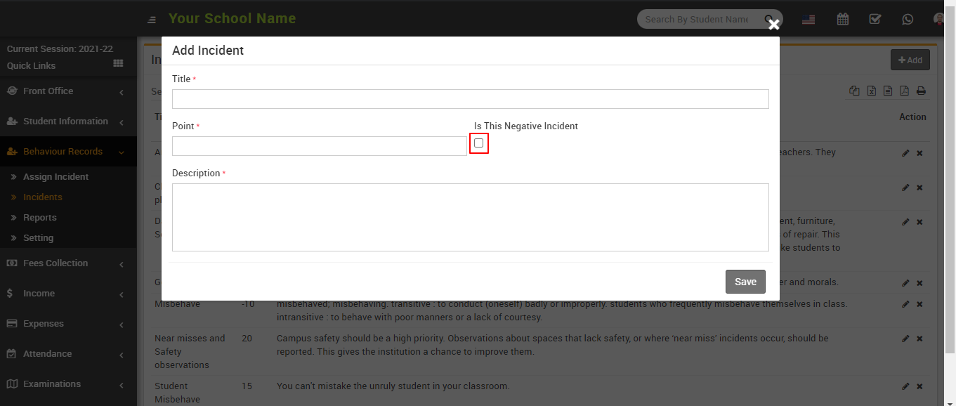 Point: In points, you can fill in the points according to the incidents, whether they are positive or negative. If the incident was positive, you could award positive points of 10, 15, 20, and so on.