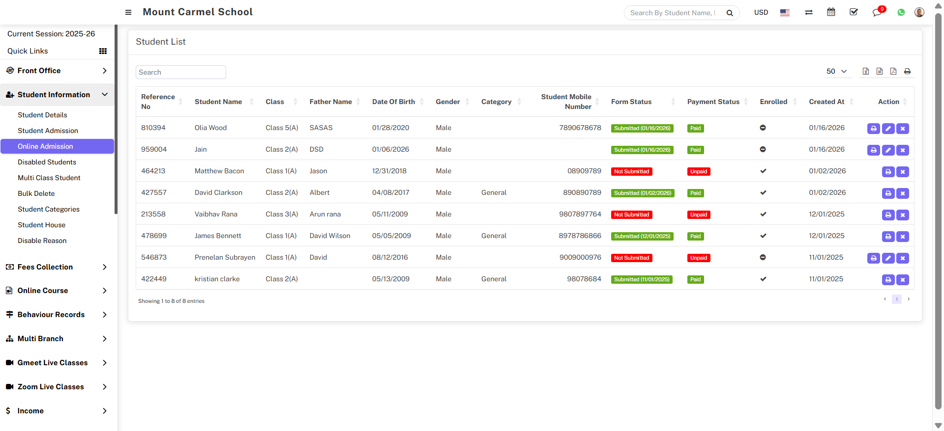 To assign fees at the time of Student Enrolment, go to Student Information > Online Admission, the student list will be open, and the Edit icon will be visible in the Action column.