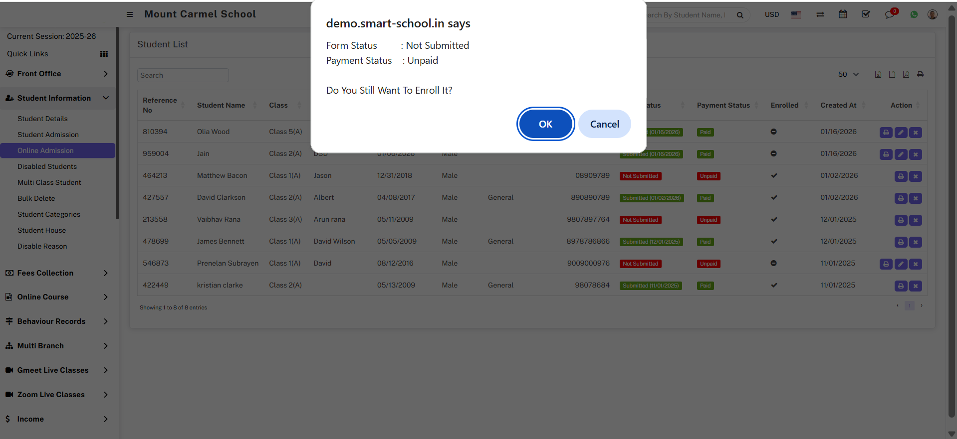 If you did not pay the fee at the time of online admission, you need to enrol that student. For that, just click on the Edit icon, which is showing in the Action column, so that the Confirmation Model will appear. When you click on the OK button,