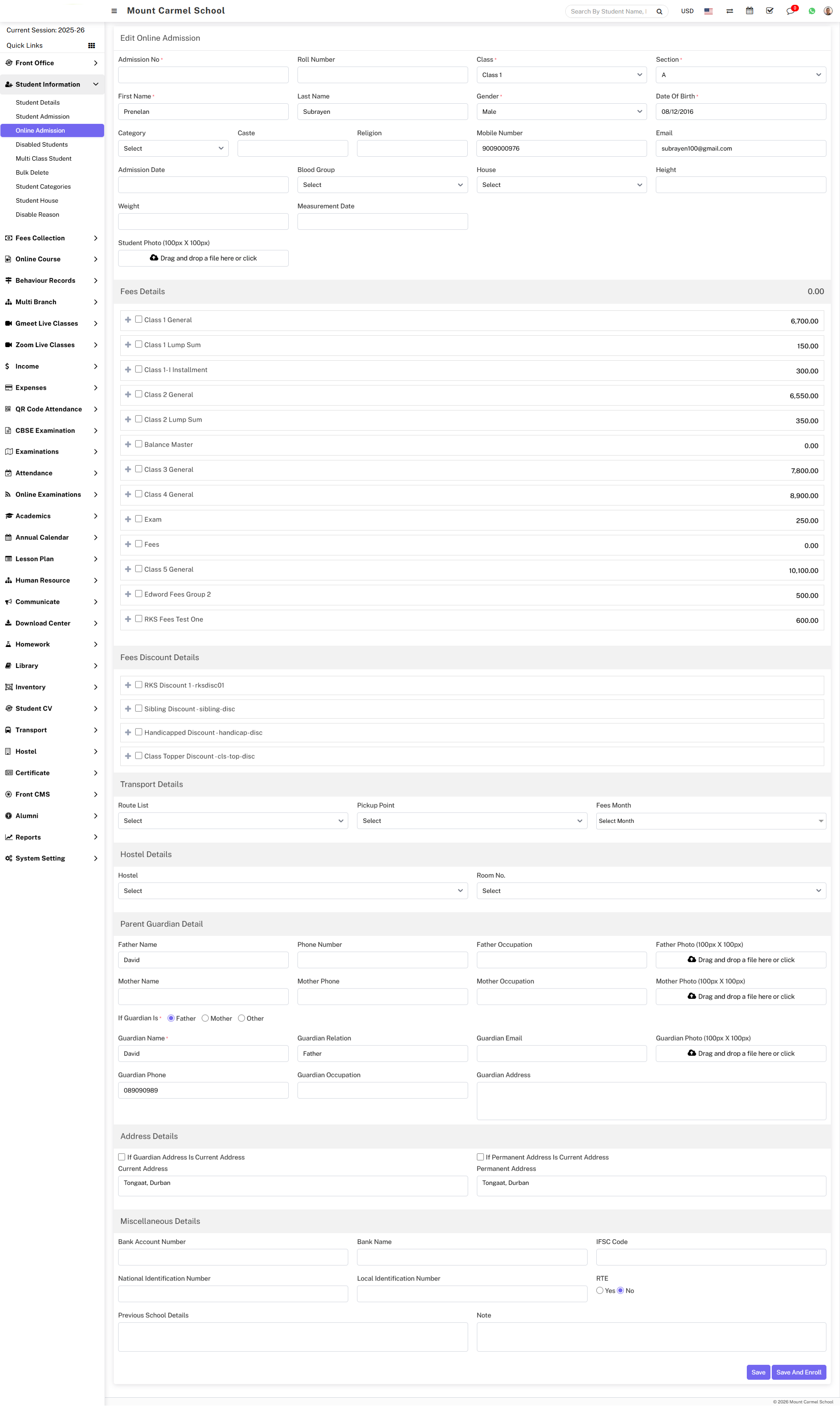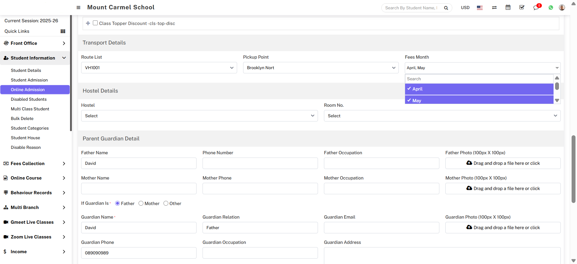 the Student Admission form will open, where you can easily assign multiple fees from the Fee Details, and you can also assign the transport fees from the Transport Details.