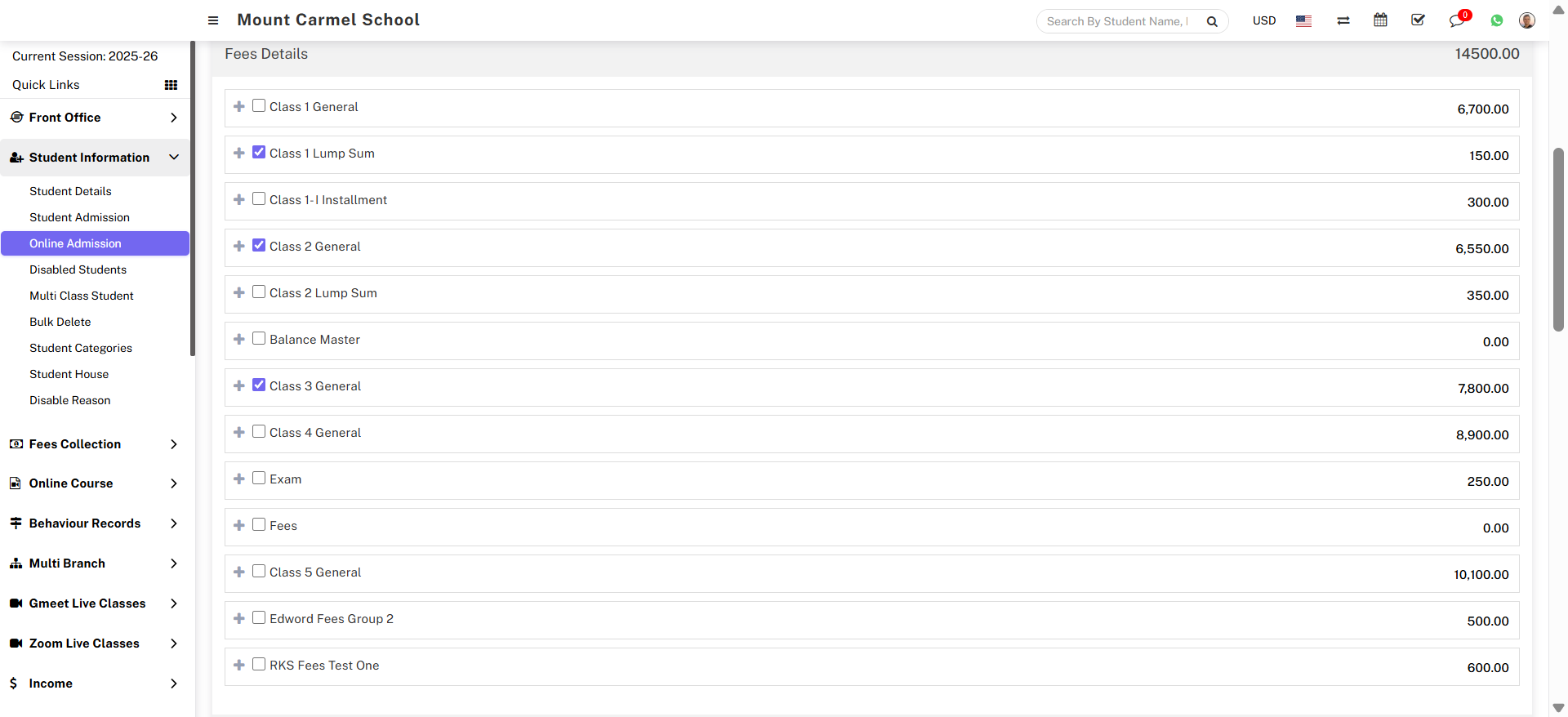 Multiple fee options are displayed in the Fee Details field. A plus icon and a check box are displayed next to the fee name. You can expand the fee details, such as fee type, due date, and amount, by clicking the Plus icon, and you can assign those specific fees to that student by checking the appropriate check box.