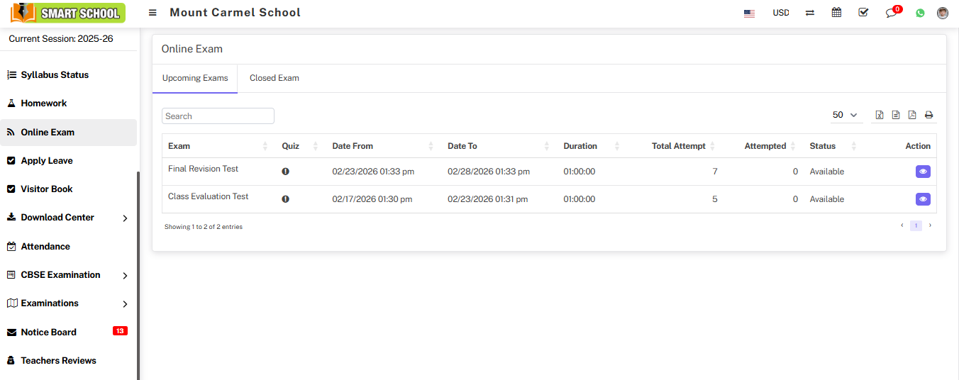 In Upcoming Exam, you can see exam details as Exam Name, Quiz (In quiz result will be display to student immediately just after exam submission (descriptive question type will be disabled), Date From, Date To, Duration, Total Attempt, Attempt, Status and Action.