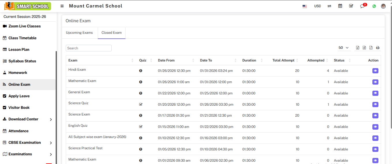 To attempt exam, go to sidebar menu and click on Online Exam. Here student can see all the available online exam. In online exam you can see Upcoming Exam and Closed Exam section are available.