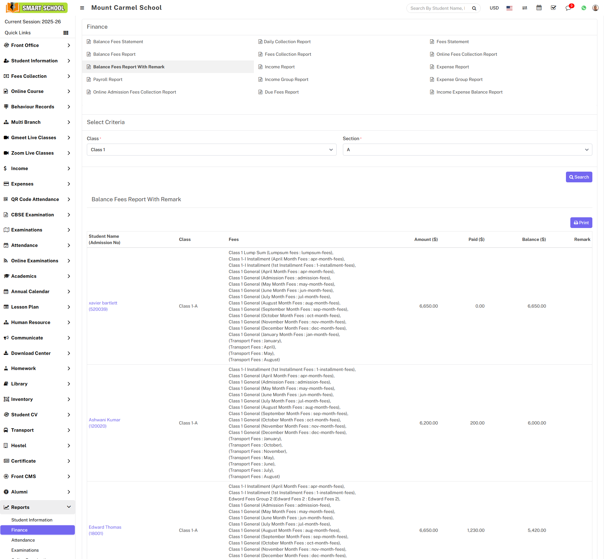 To check Balance Fees Report with Remark report, go to Report> Finance Click on Balance Fees Report with Remark report. Here select Class and Section then click on Search button. The list of balance fees report with remark will be show in the below.