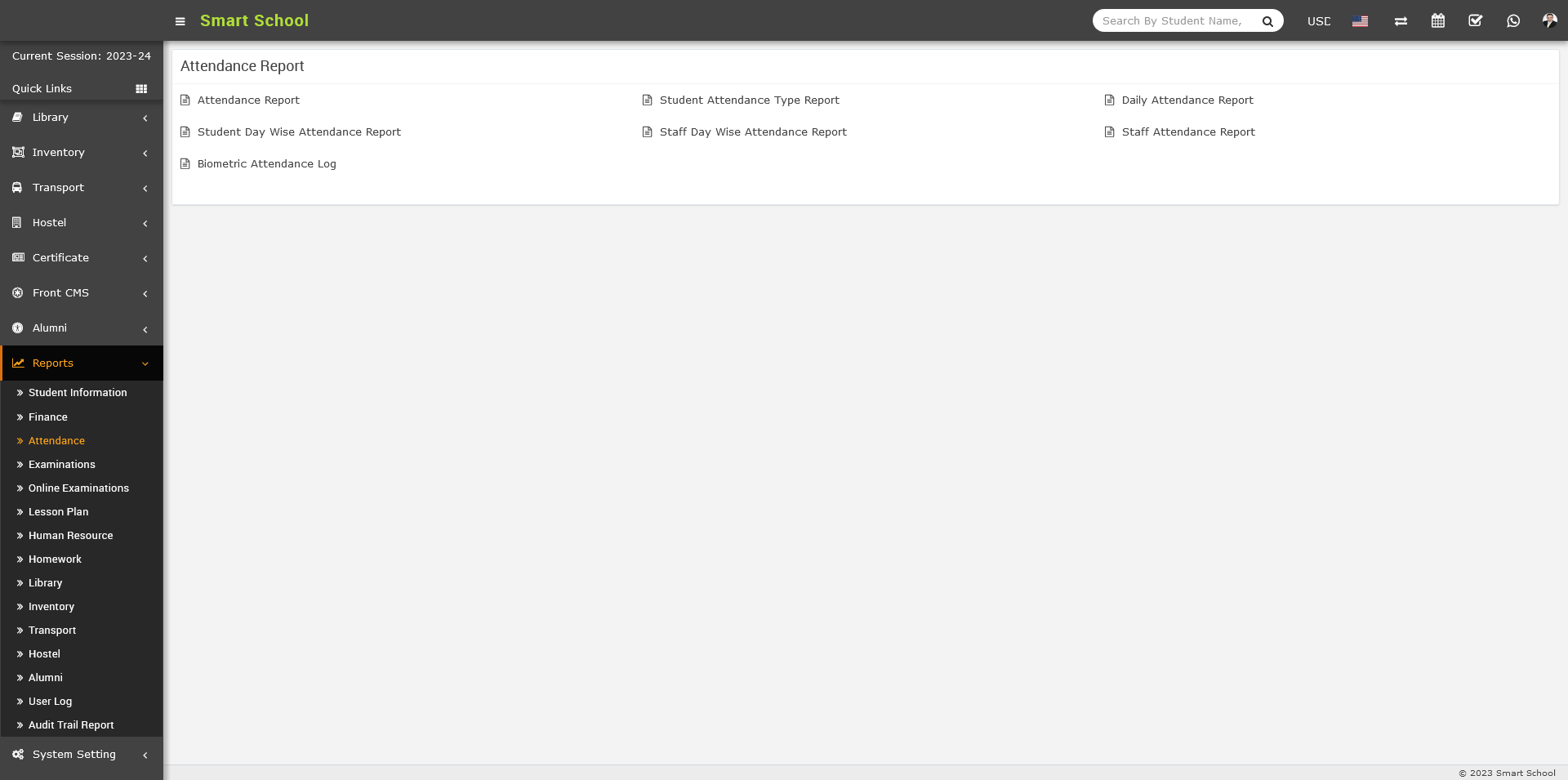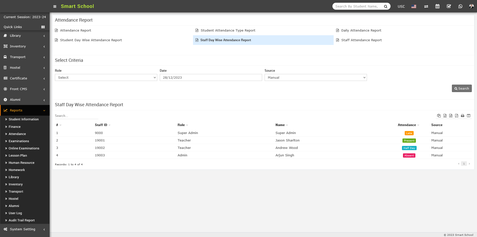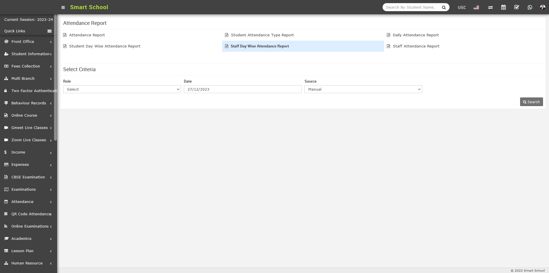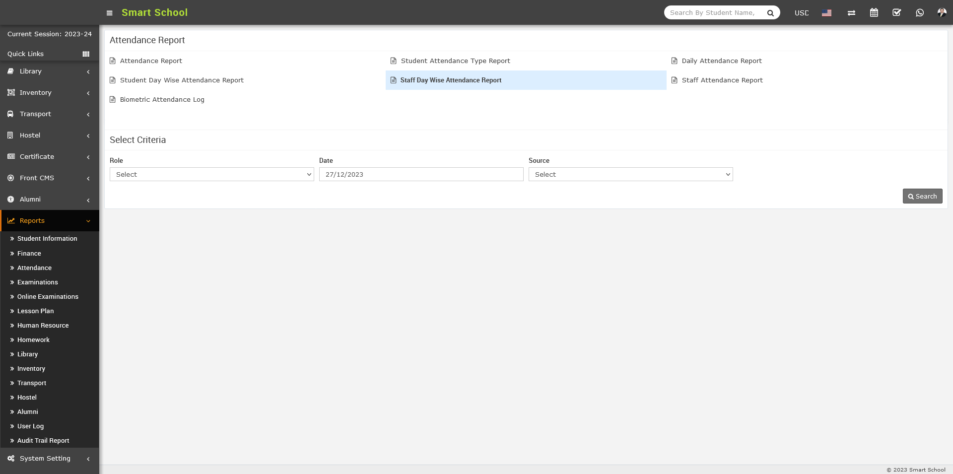 On the right side you can see the multiple attendance reports are showing and one of them staff day wise attendance report is available, simply click on Staff Day Wise Attendance Report, search criteria will be open in below.