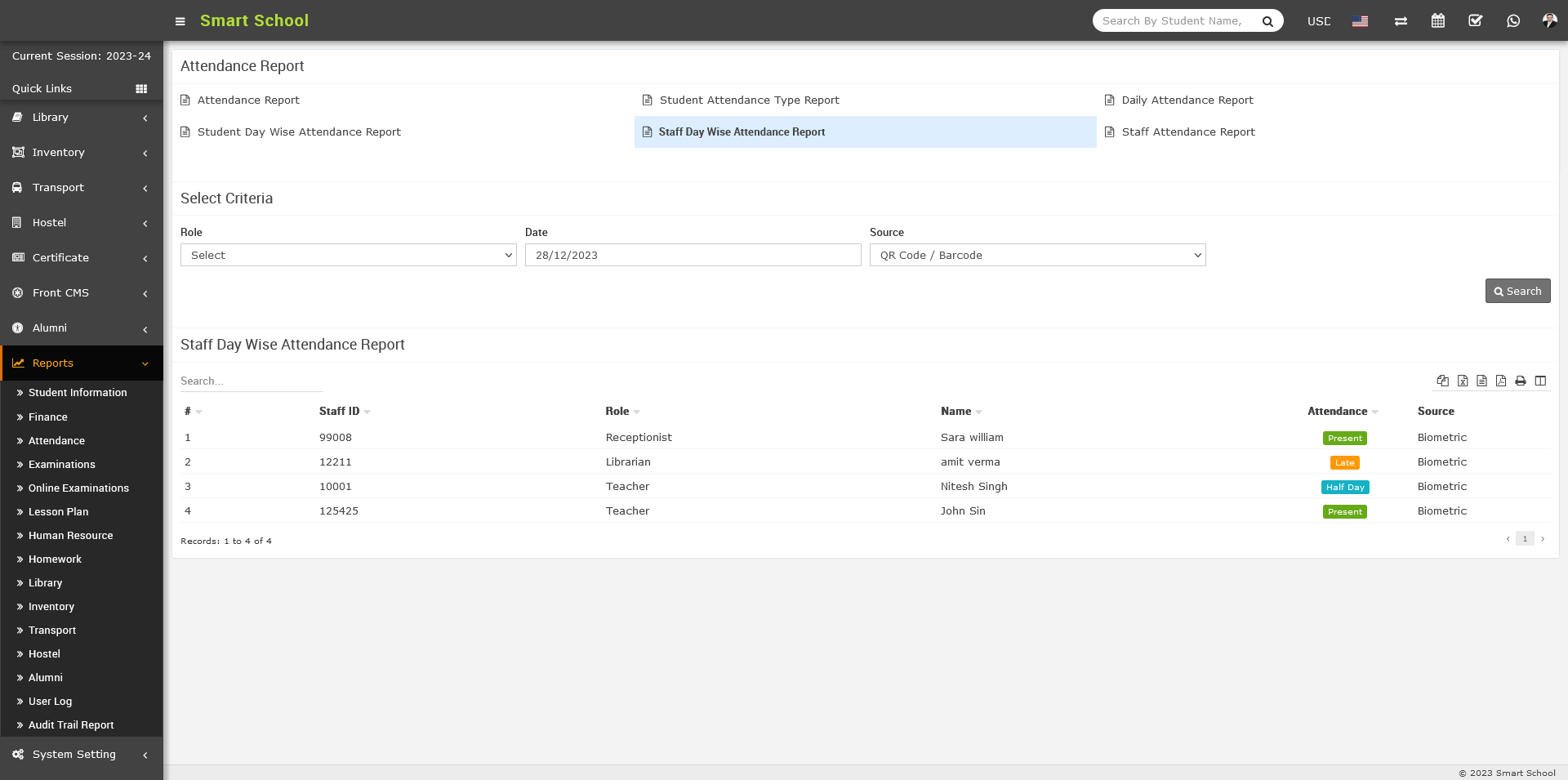 Note : - In QR Code / Barcode Attendance, Absent and Holiday as attendance status will not be show in the Attendance column on the staff day wise attendance report.