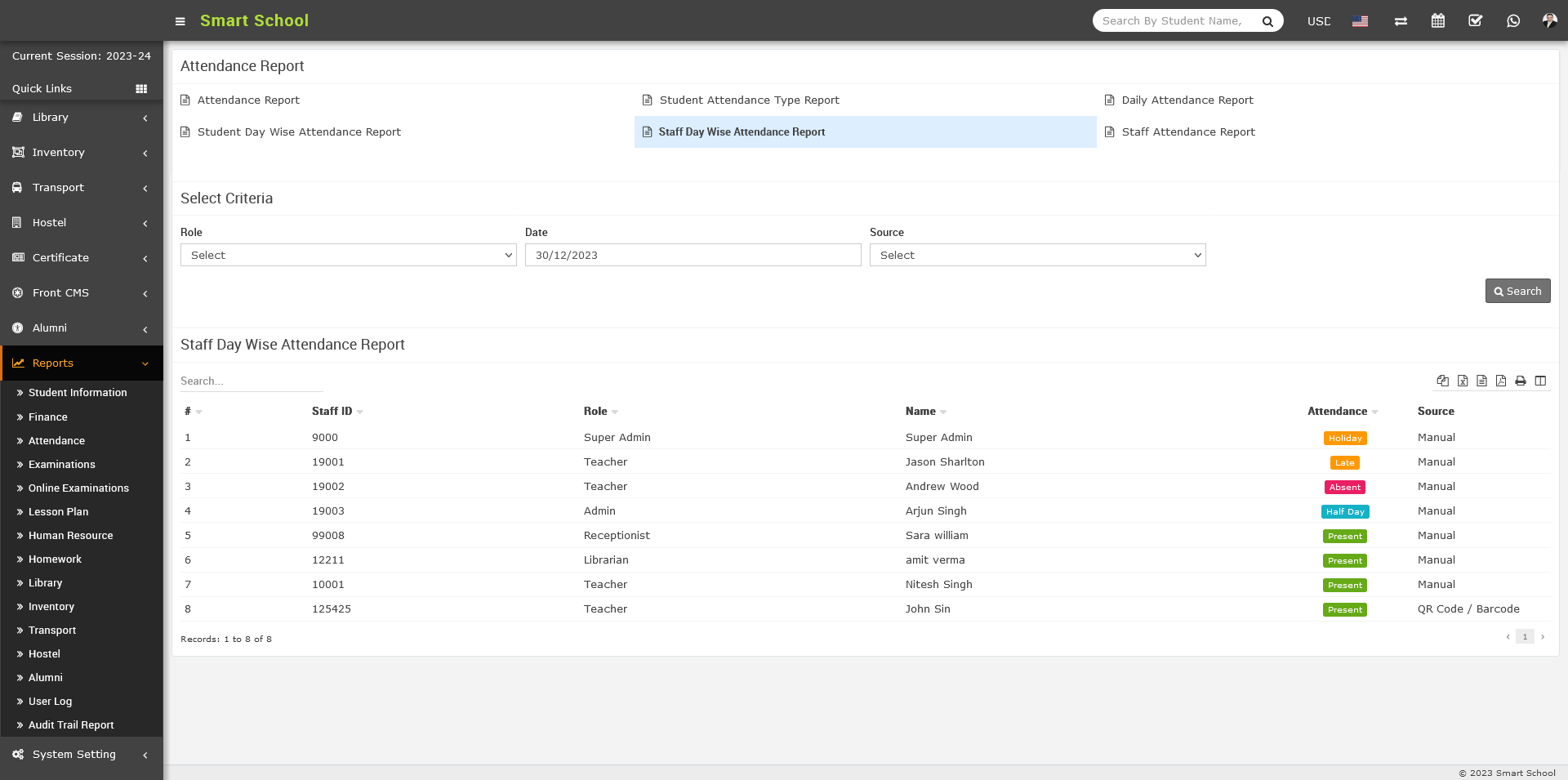 Here, you can see the first option is Role, when you click on role, staff role list will be open, select one role whose you want to see the attendance report and select the attendance date and source, here source you can get three option Manual, QR Code / Barcode.