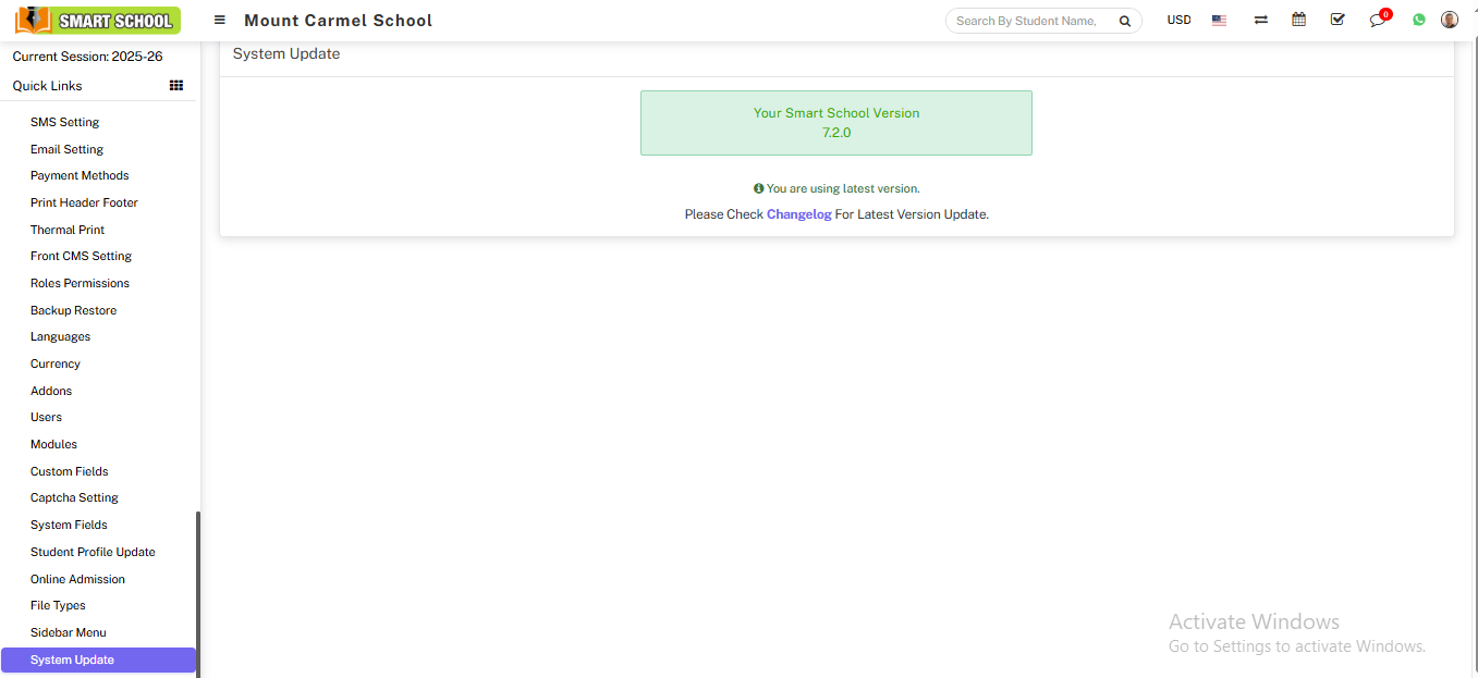 To check Soft School Version, login from superadmin panel and then go to System Settings > System Update link. Here you can see your current Soft School Version and also update to the newest version if available any.