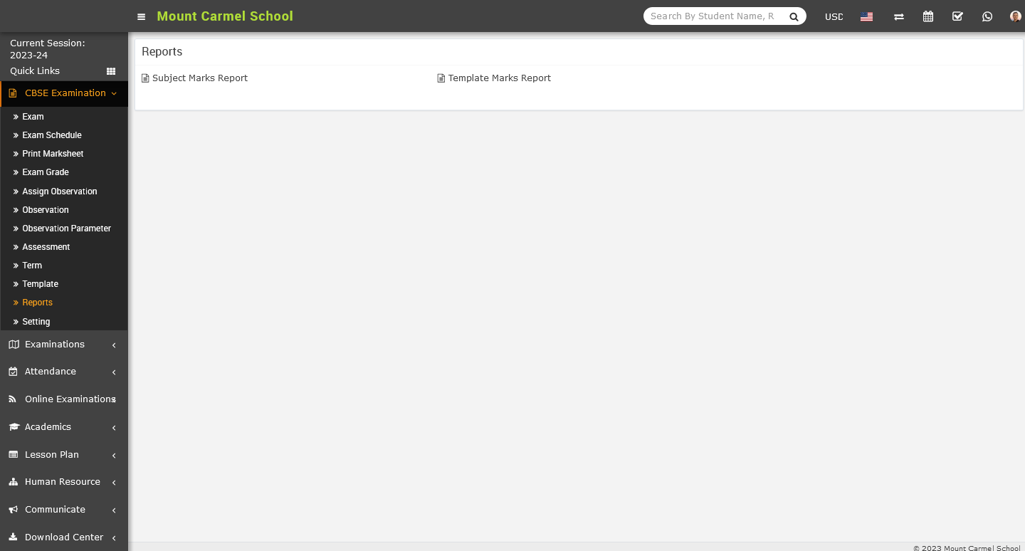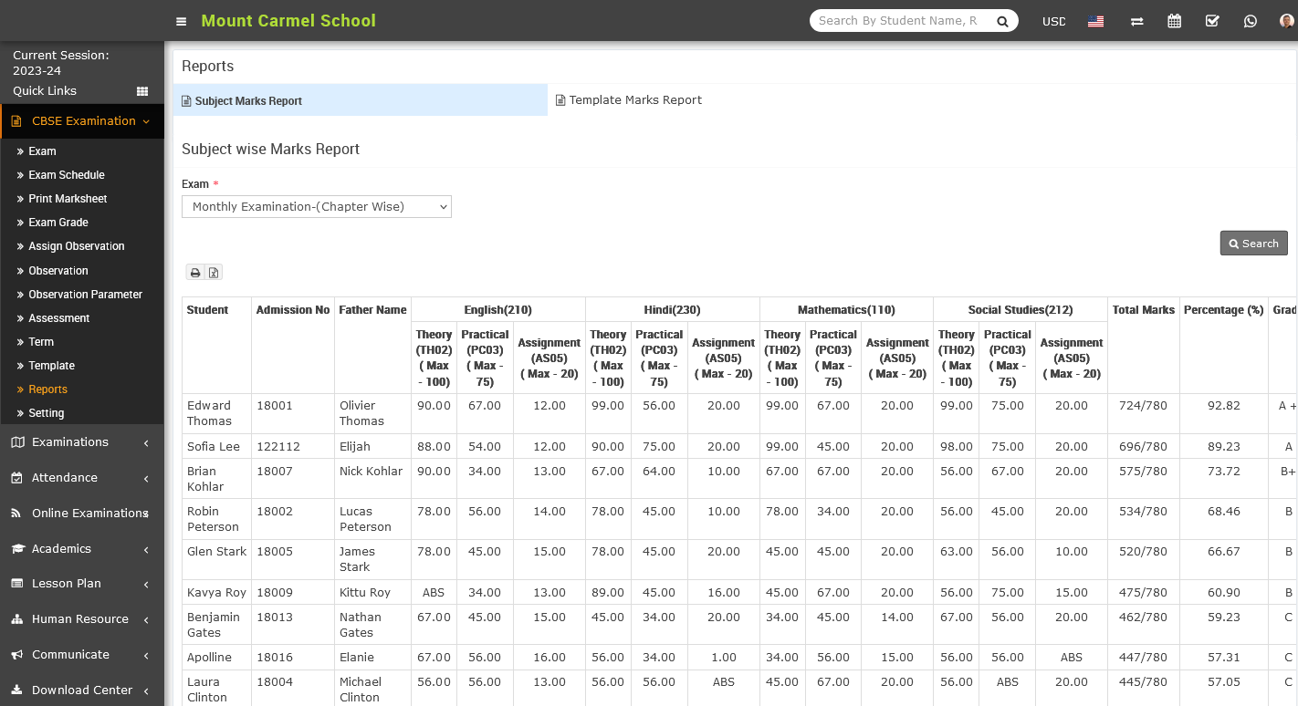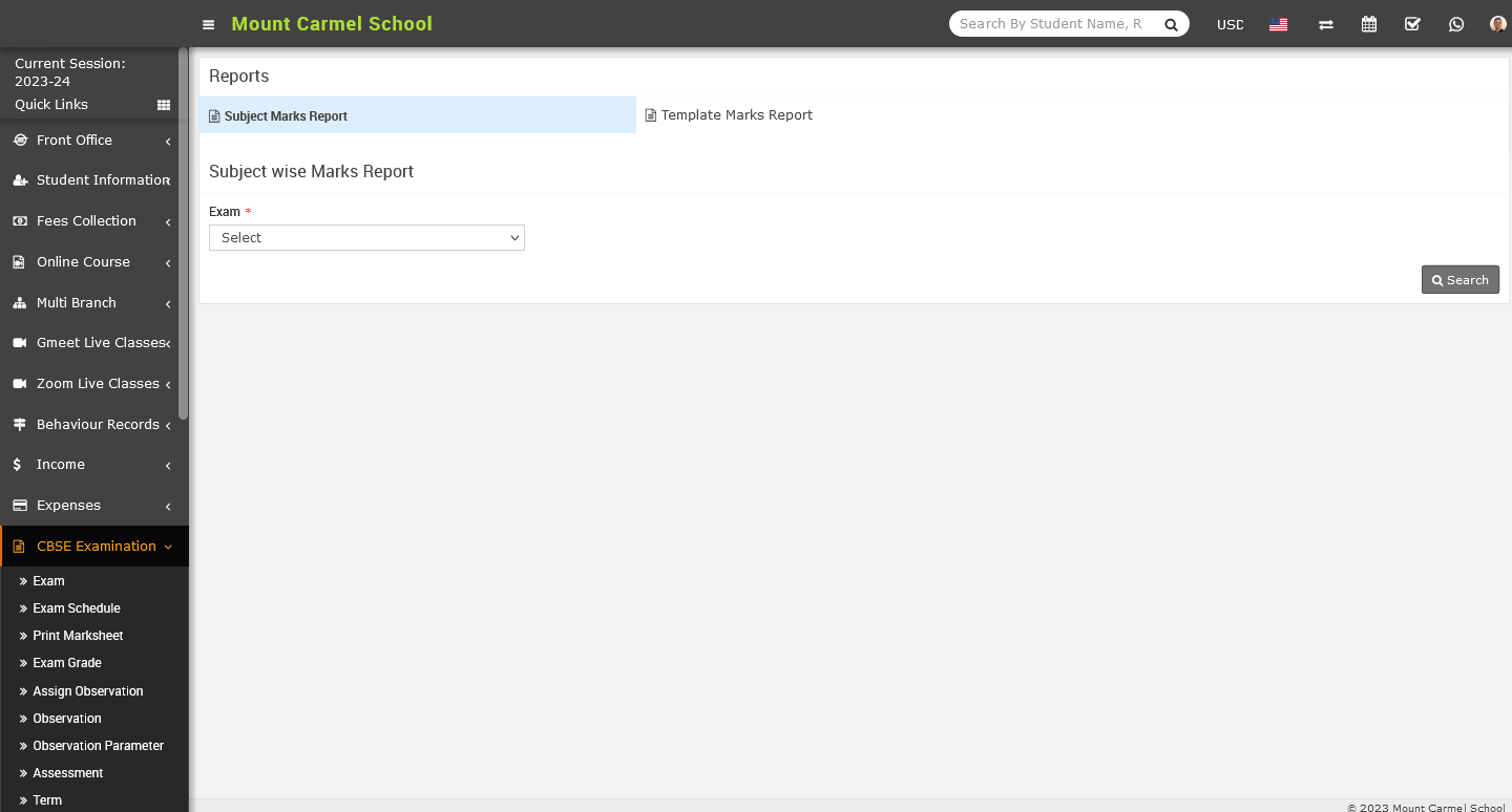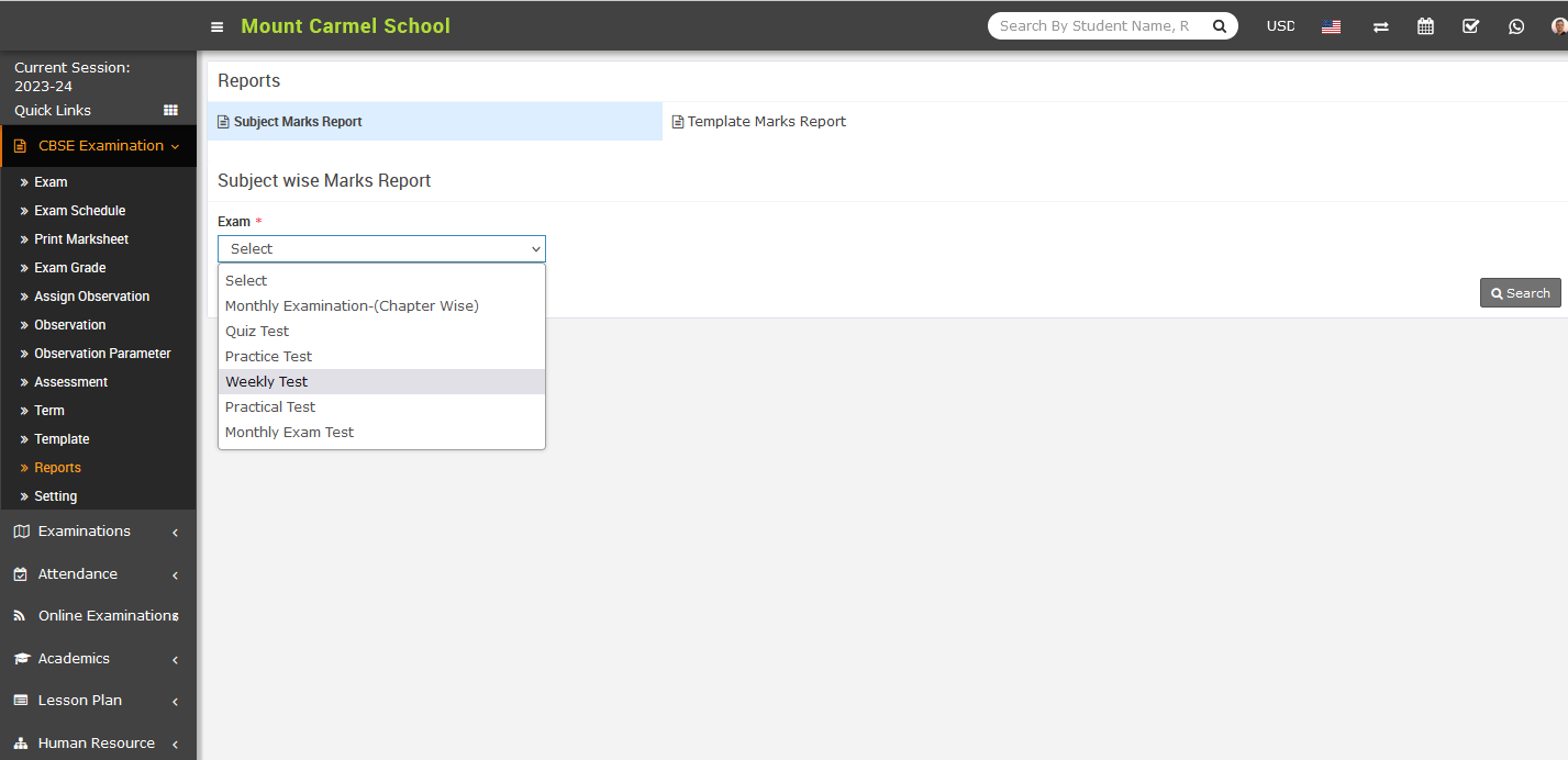 To check the subject marks report, go to the CBSE Examination > Reports. Once you have clicked on the Report, the Report page will appear on the right side.