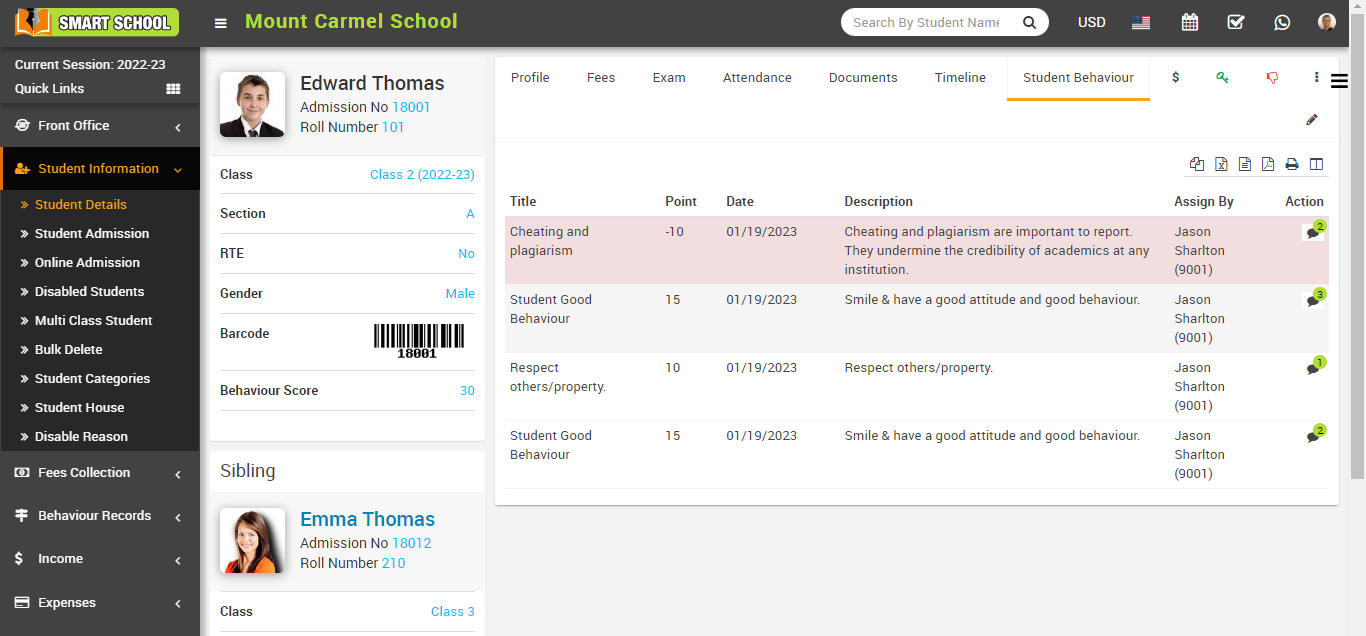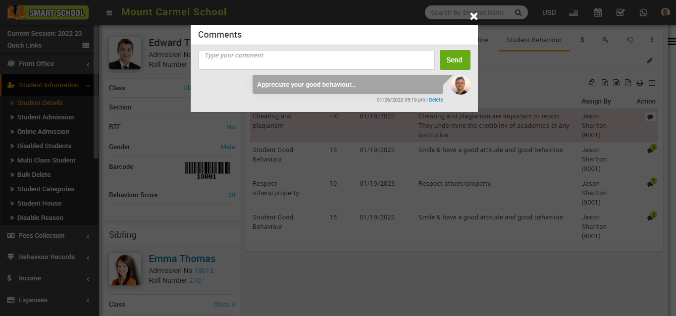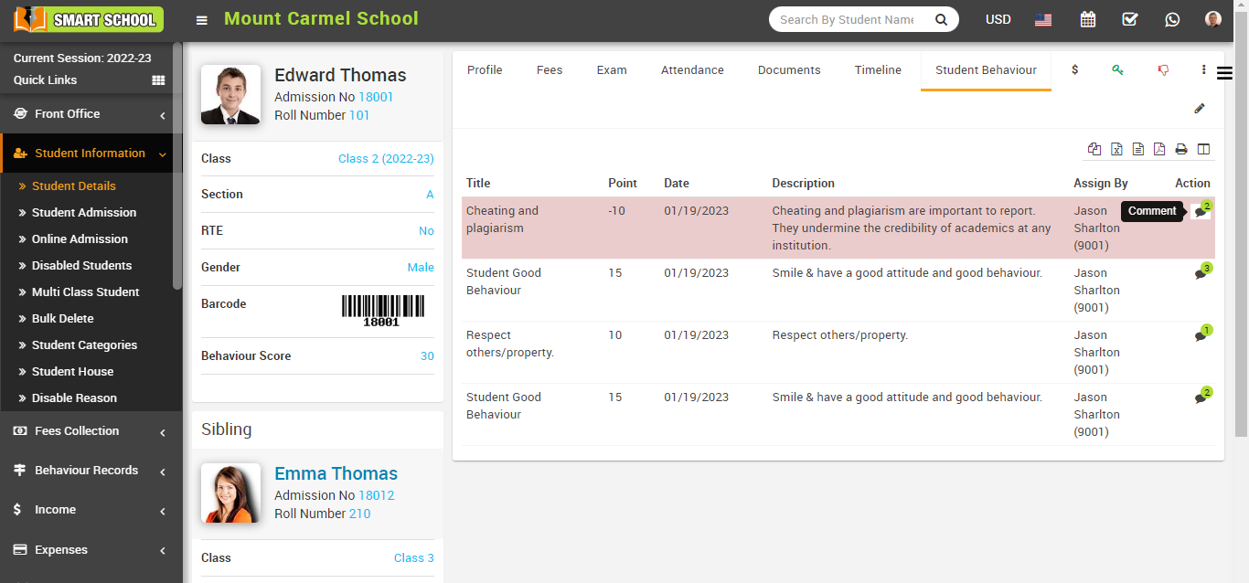 In the incident of student behaviour list showing in the student profile, you can see all the details showing in this table, and now in the action column, you can see the comment option available.