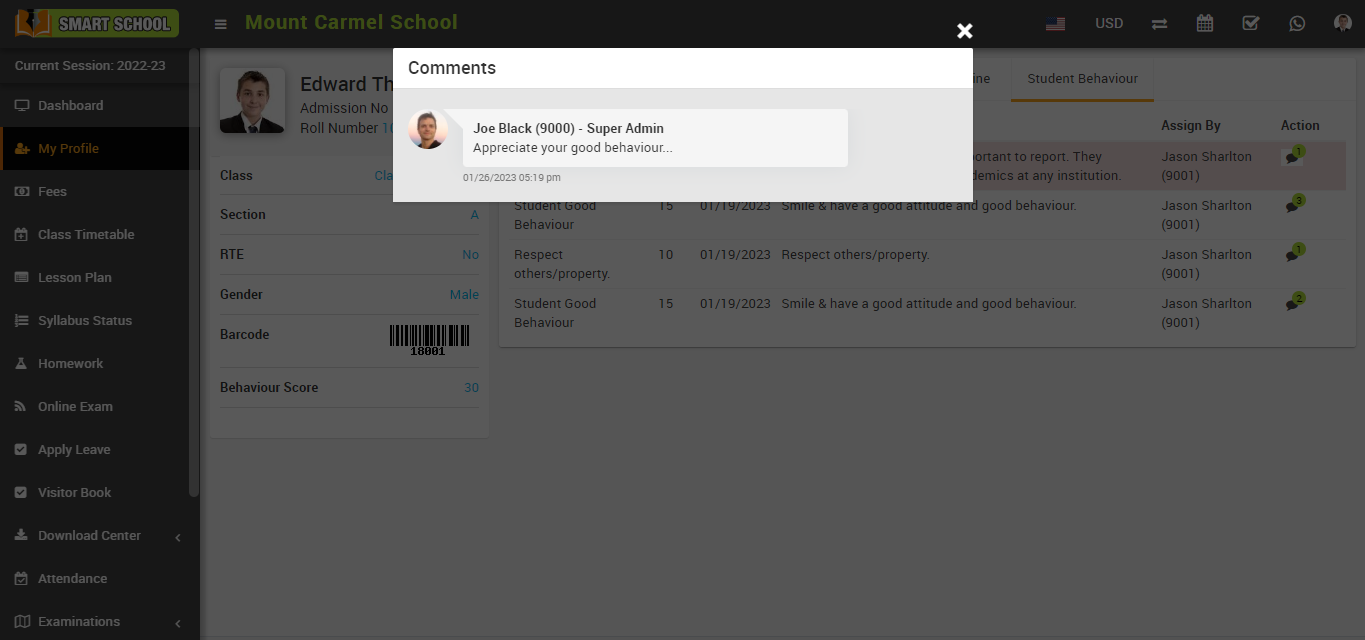 In the student behaviour tab, you can see all the details related to the incident now, in this table, you can see the action column in this action column, you can see the comment option available, and here, students can see the comment on the incident that was left by the superadmin or staff.