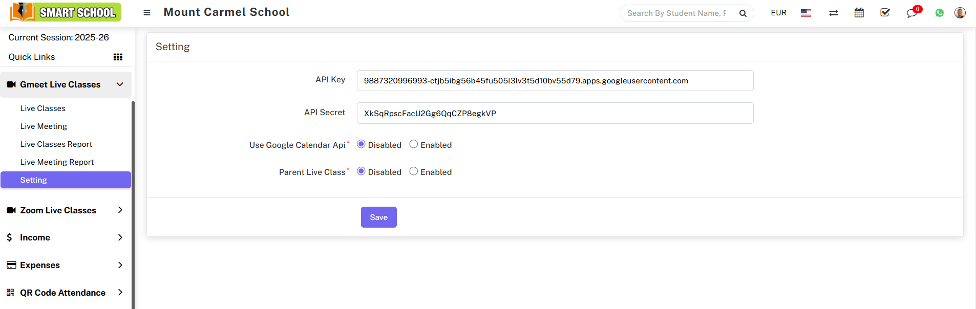 To configure Gmeet live Class, go to Gmeet Live Classes >> Setting, then enter API Key and API Secret (to get API Key and API Secret follow https://smart-school.in/article/how-to-get-gmeet-api-key-and-secret-key link) and select Use Google Calendar Api Enable/Disable (if you select this option Enabled then you need to sign in your Gmail account before adding Gmeet Live Classes or Meeting and if you check this option Disabled then you need to enter your Gmeet URL while creating Gmeet Live Classes or Meeting) and then click on the Save button.