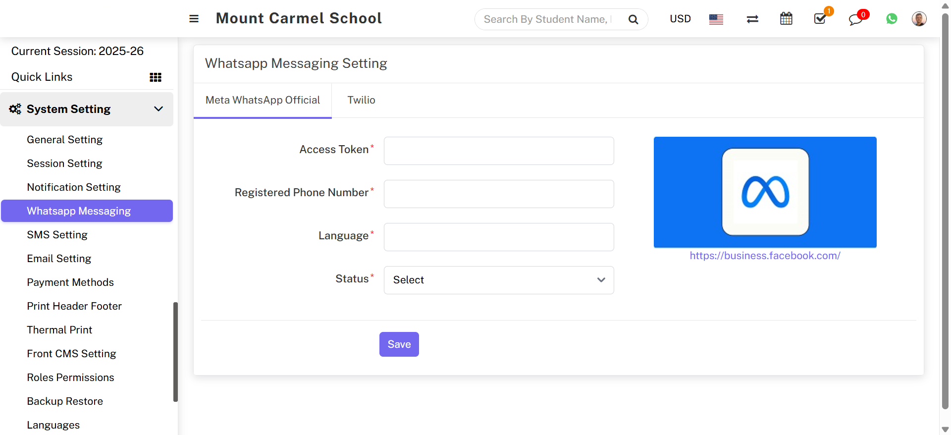 Soft School supports two WhatsApp service providers: