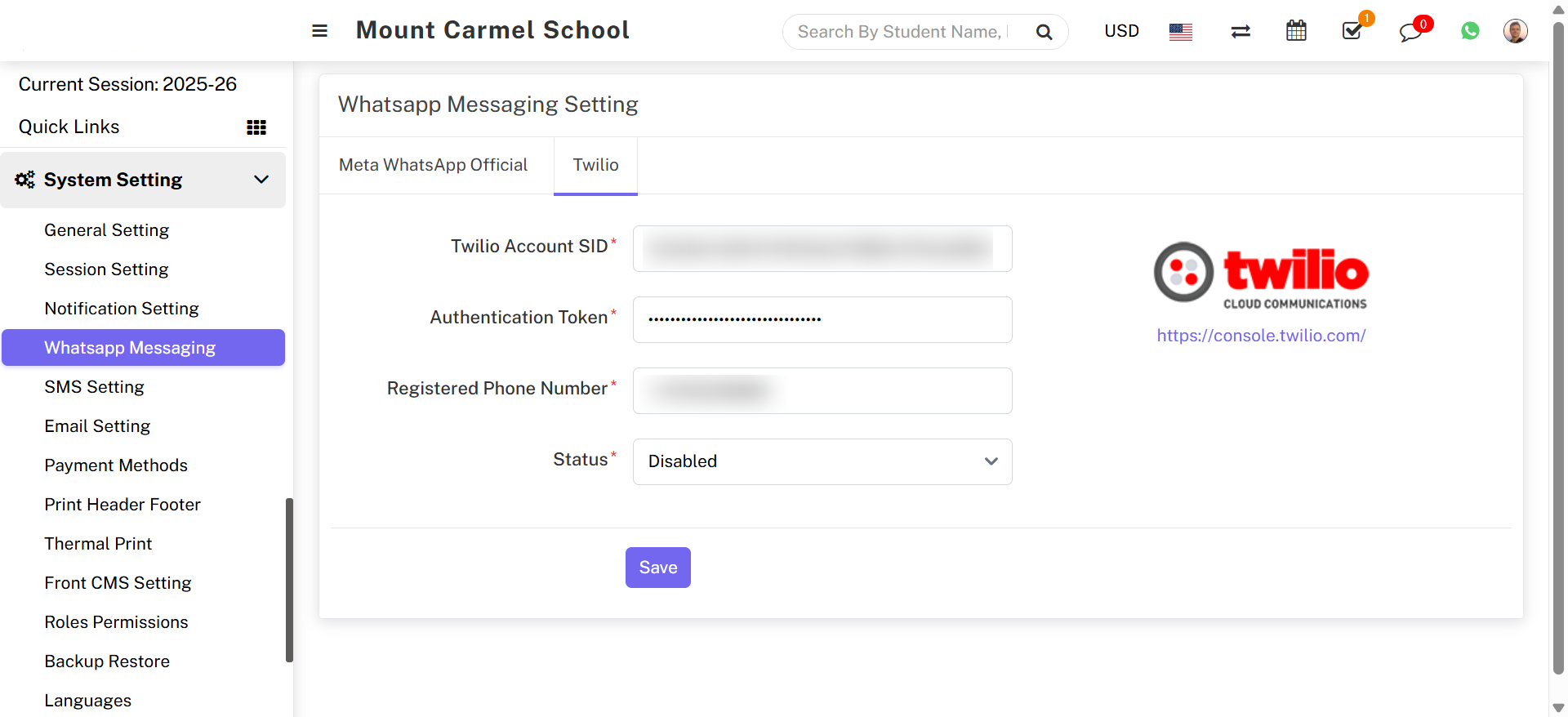 - Enter Account SID, Authentication Token, Registered Phone Number, and Status