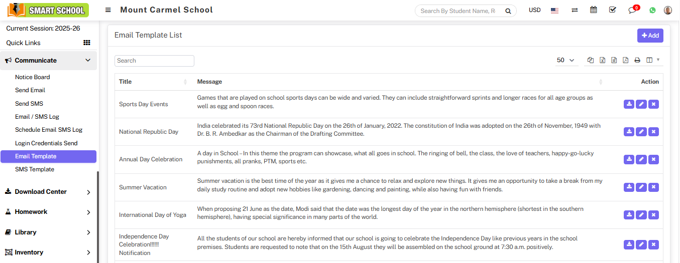 To create Email template, go to Communicate > Email Template, here you can view email template list.