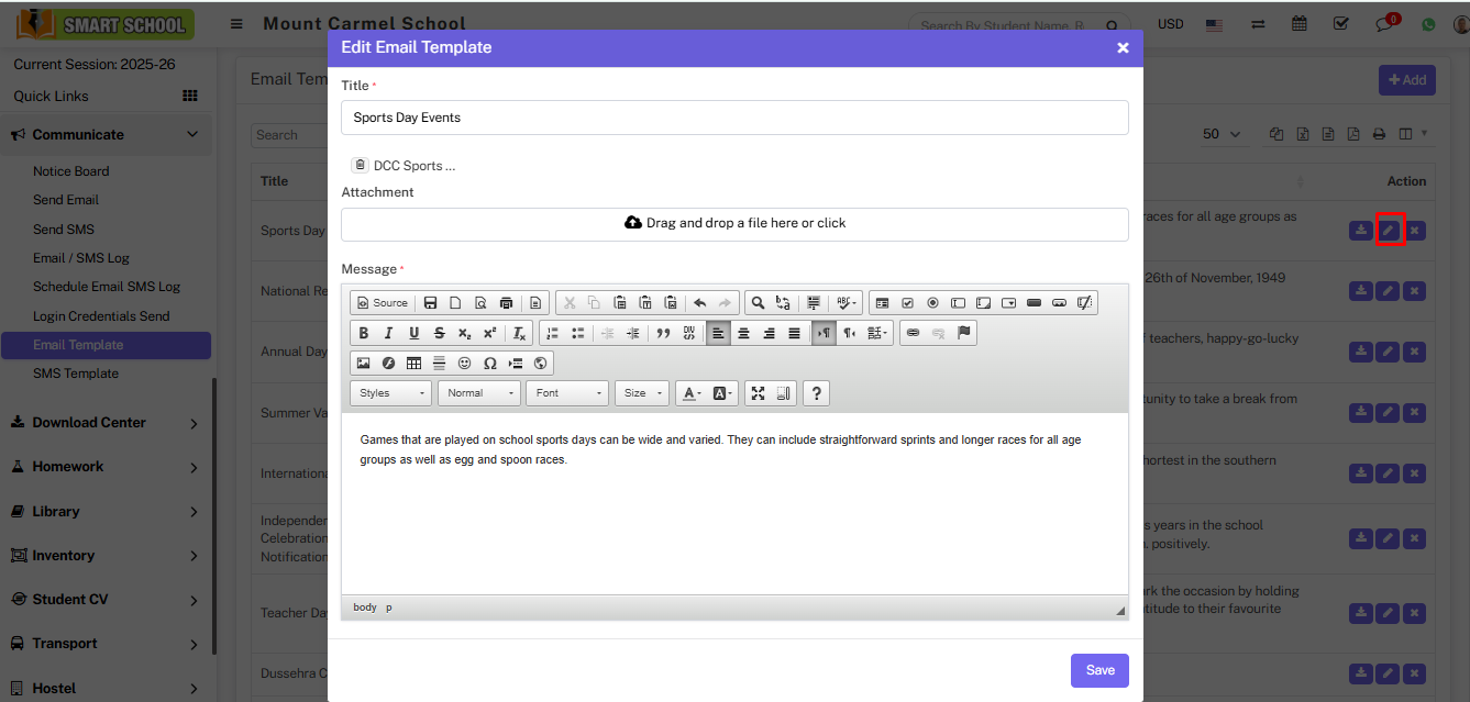 Now, mention the Title for email template, and select the file for Attachment and create the message then click on the Save button, so that new email template will added successfully and you can view in Email Template List.