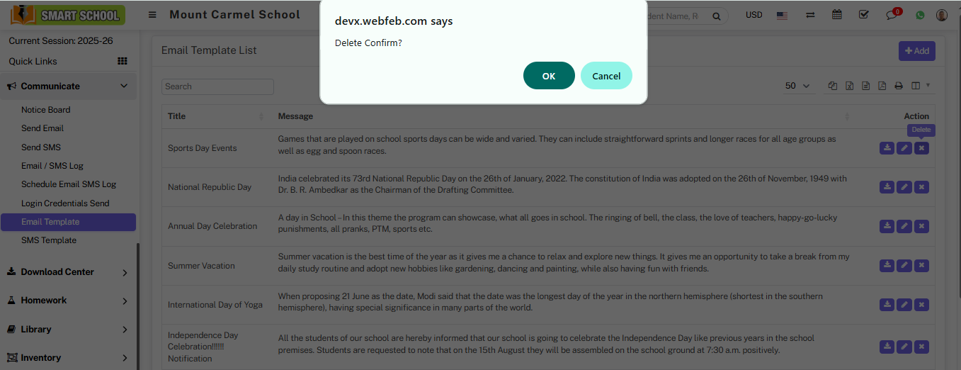 To delete the template, simply click on Delete icon showing in Action column, delete confirmation model will be open.