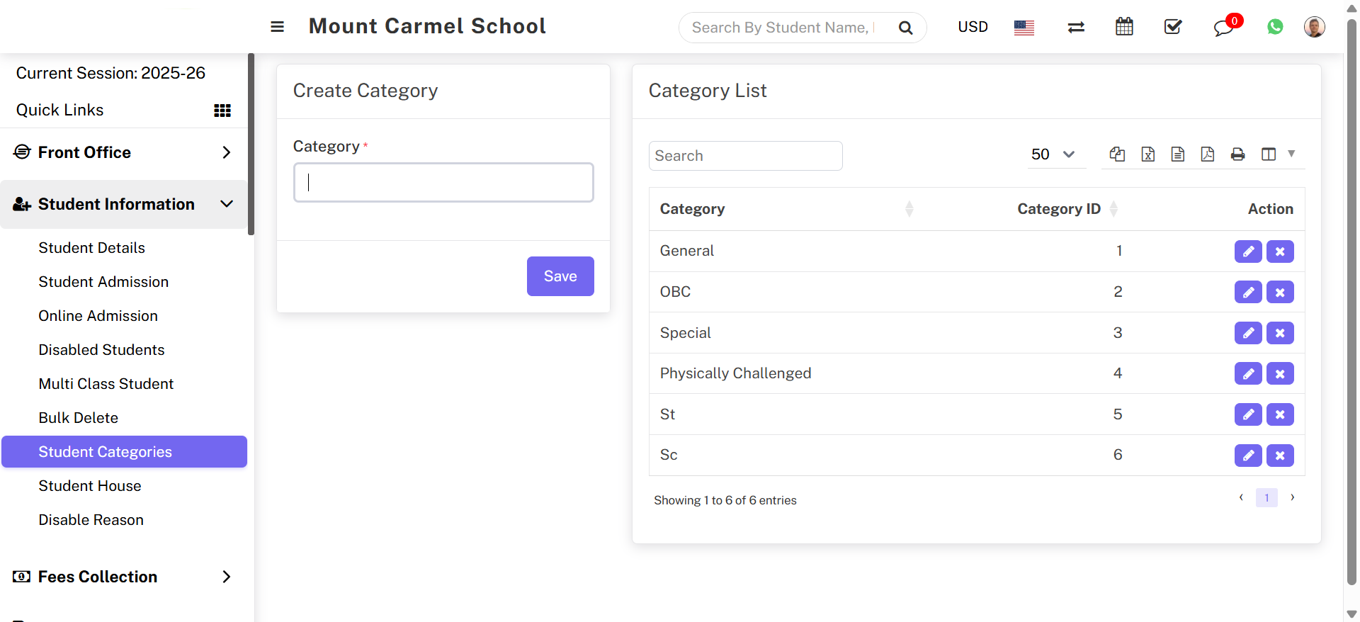 To edit student category click on Edit icon and to delete student category click on Delete icon present in the category list.