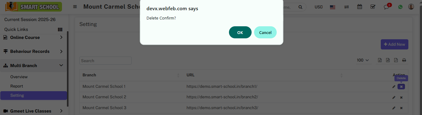 To Delete Branch, click on the Cross icon in the right corner, after clicking on Cross icon, Delete confirmation modal will be open then click on OK button, branch will be deleted successfully.