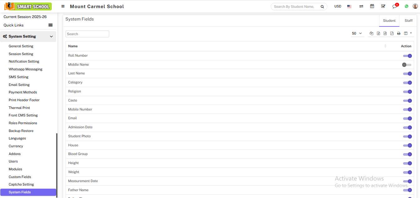 To disable system field, go to System Settings > System Field. Here you can see all enabled field. You can enable/disable any system field in student and staff.