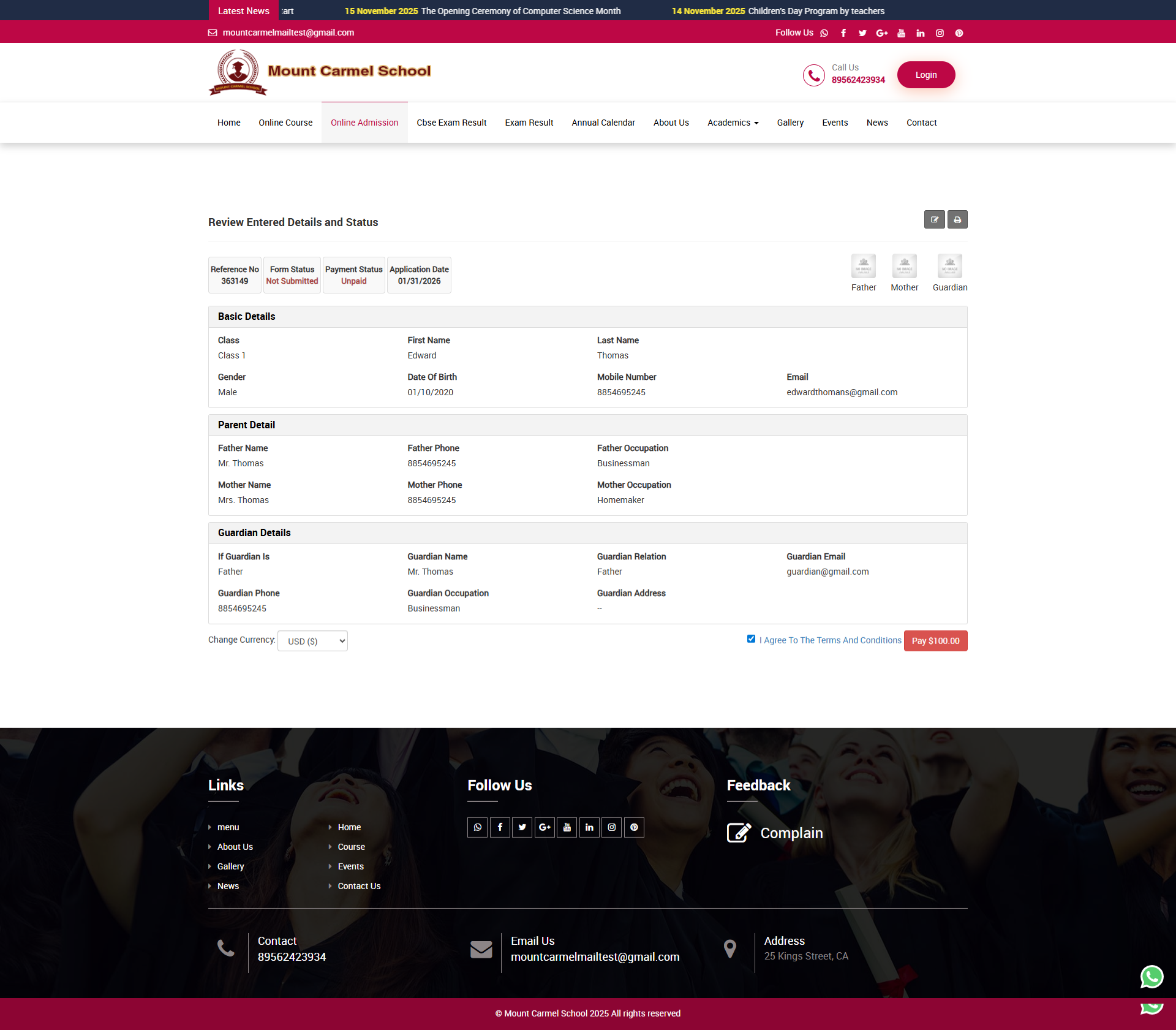After submitting form, this will redirect you in Online Admission Review Details page where you can check your details what you have filled previously.