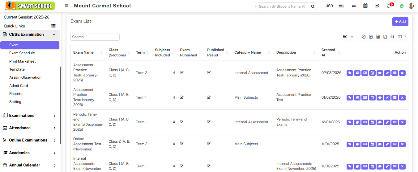 On the right side, you can see the Exam list. Within that list, on the right side, there is an action column where you can find the delete icon. Additionally, beside the delete icon, there is also the Generate Rank icon available.