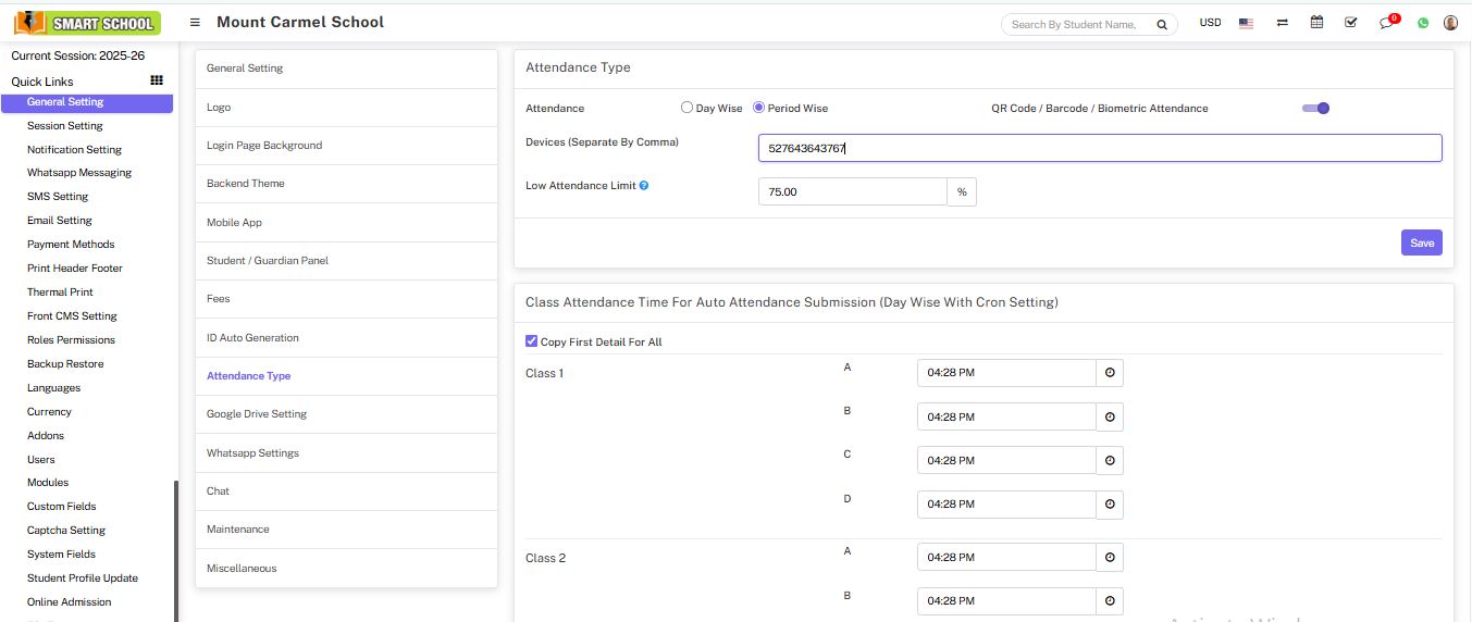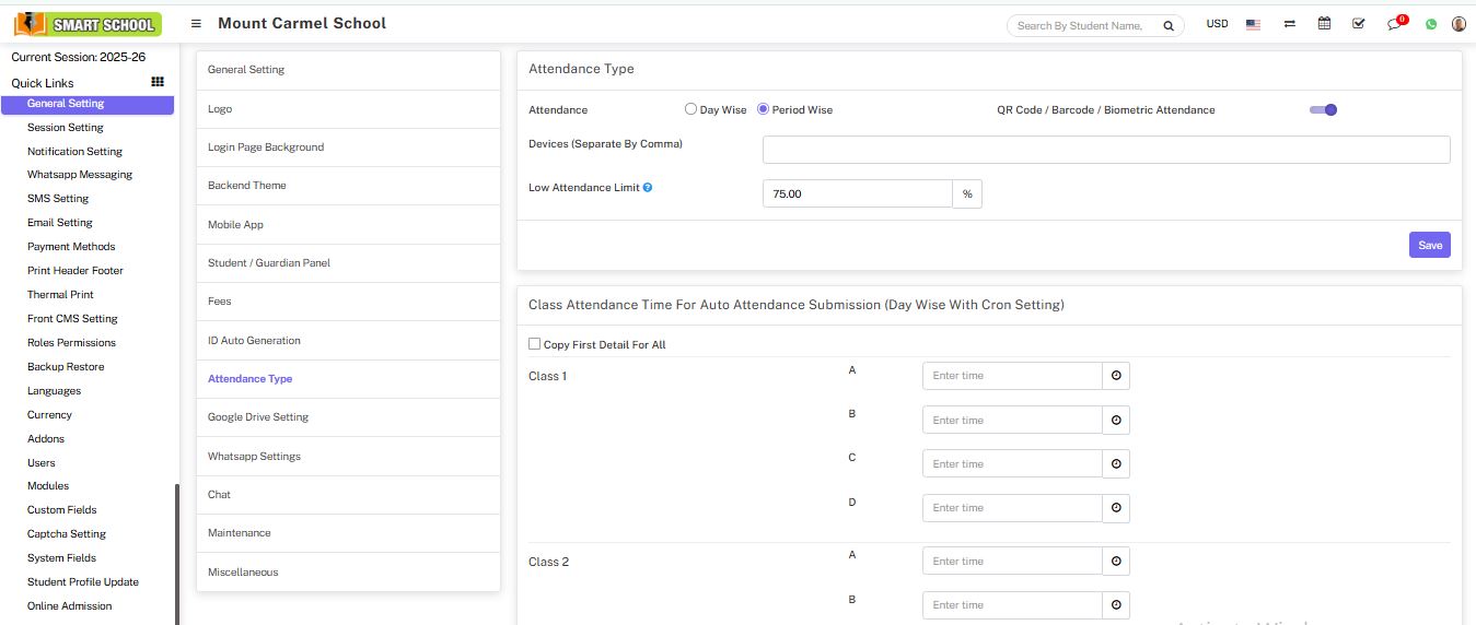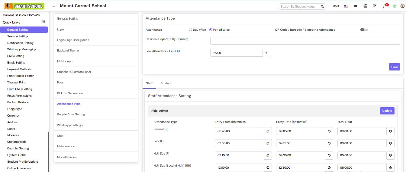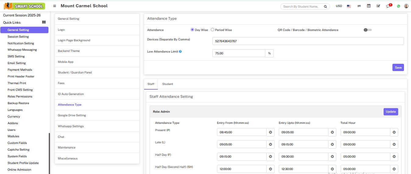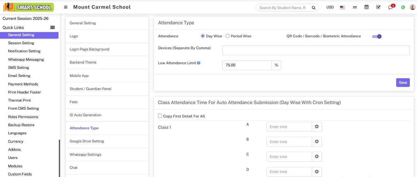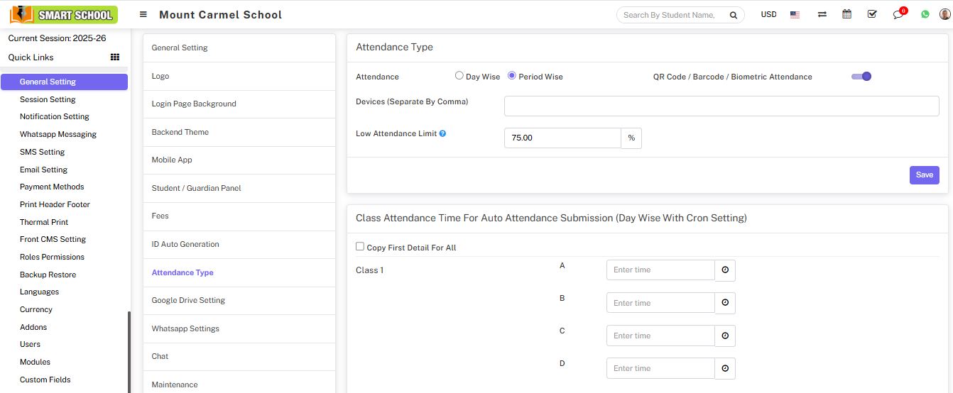Attendance module workflow: In Soft School, we can use two types of attendance (Attendance and Biometric Attendance). You can run any type at time attendance day wise and period wise and attendance type can be select from System Settings > General Settings. In Attendance Type here select the any one attendance type Day Wise or Period Wise and click on Save button.