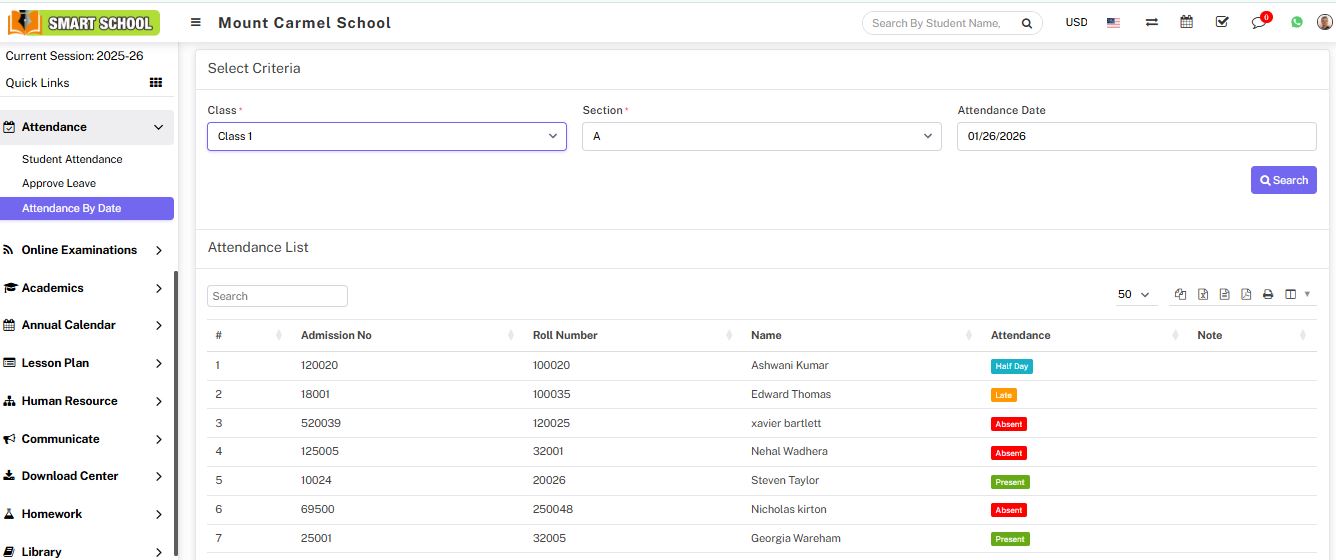 In day wise attendance, just you need to go Attendance > Attendance By Date. Here, you have to select the class, section, and attendance by date, then click on the Search button. An attendance list of students will open below, and you can see the attendance of multiple students in that relevant class and section that you set.