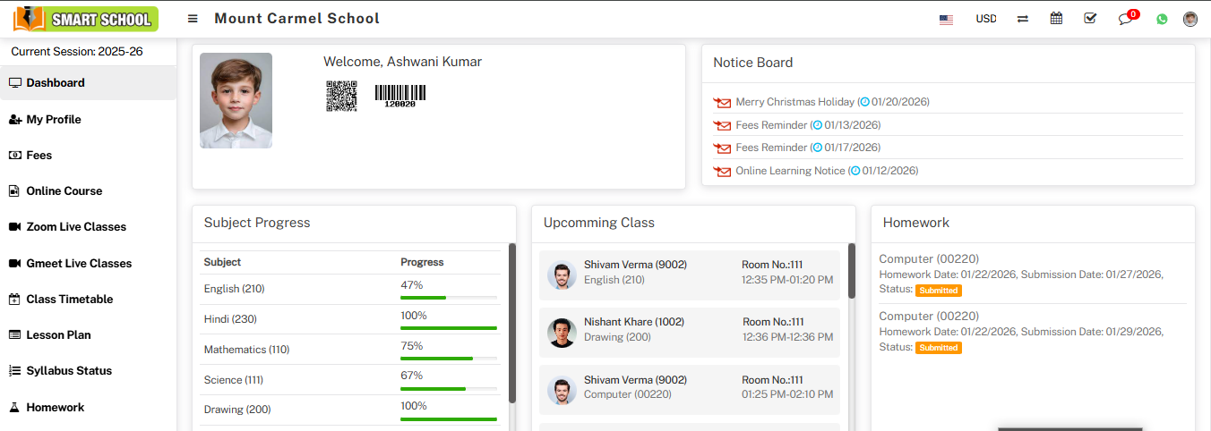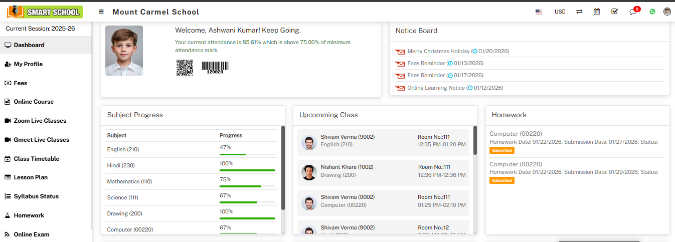 With the help of this feature, you can set the limit of attendance in the form of a percentage and then click on the save button. The attendance limit will be set and a message will be displayed on the student dashboard. In the low attendance limit, one question mark is available, it will show as Below it attendance will be mark as low attendance.
